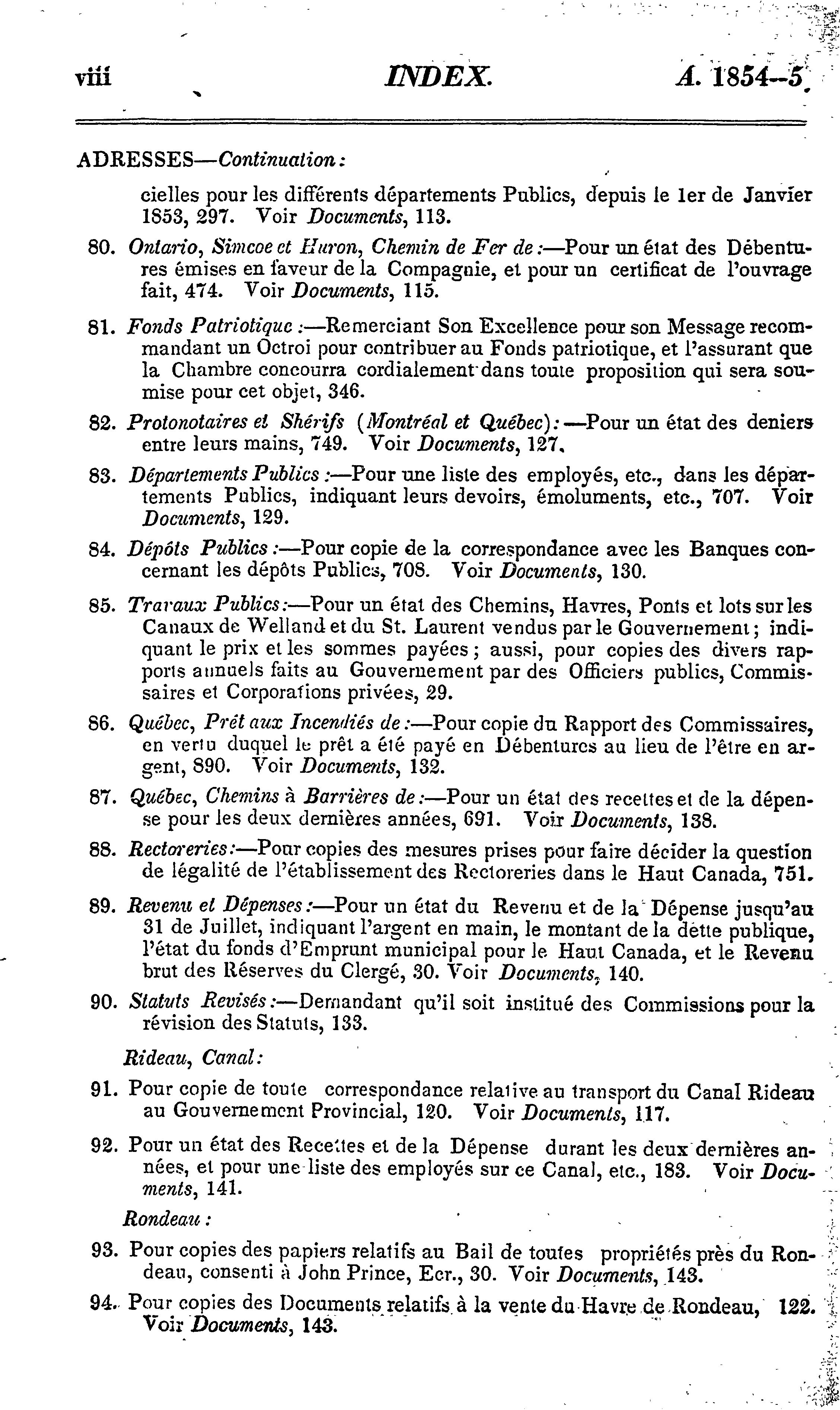 - Index des journaux de l'Assemblée législative de la Province du Canada depuis le 5 septembre 1854 jusqu'au 30 mai 1855, les deux jours inclus, dans la dix-huitième année du règne de notre souveraine dame la Reine Victoria : étant la 1ère session du 5e Parlement provincial du Canada : (partie III) : 1854/55 (pt. 3)