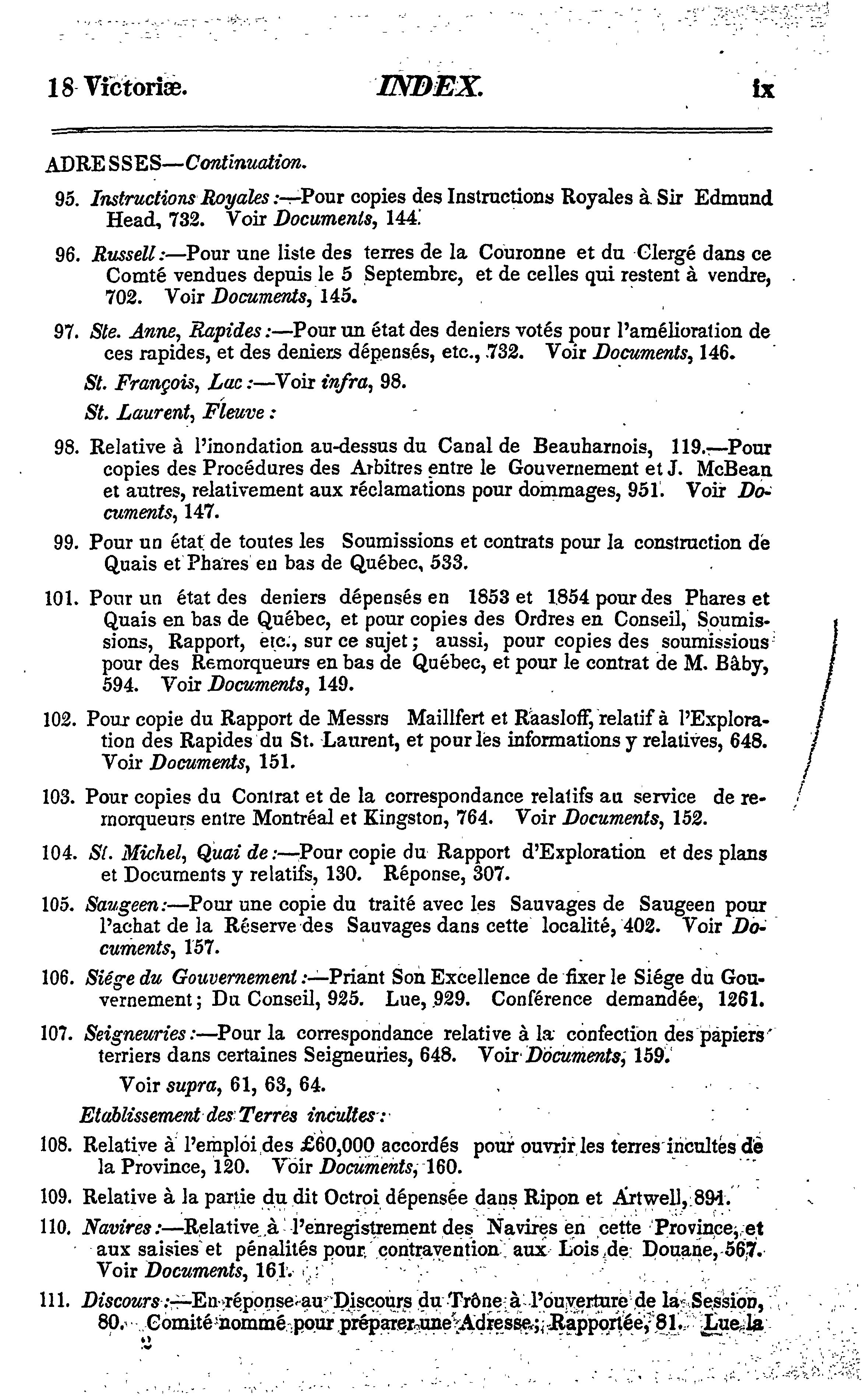 - Index des journaux de l'Assemblée législative de la Province du Canada depuis le 5 septembre 1854 jusqu'au 30 mai 1855, les deux jours inclus, dans la dix-huitième année du règne de notre souveraine dame la Reine Victoria : étant la 1ère session du 5e Parlement provincial du Canada : (partie III) : 1854/55 (pt. 3)