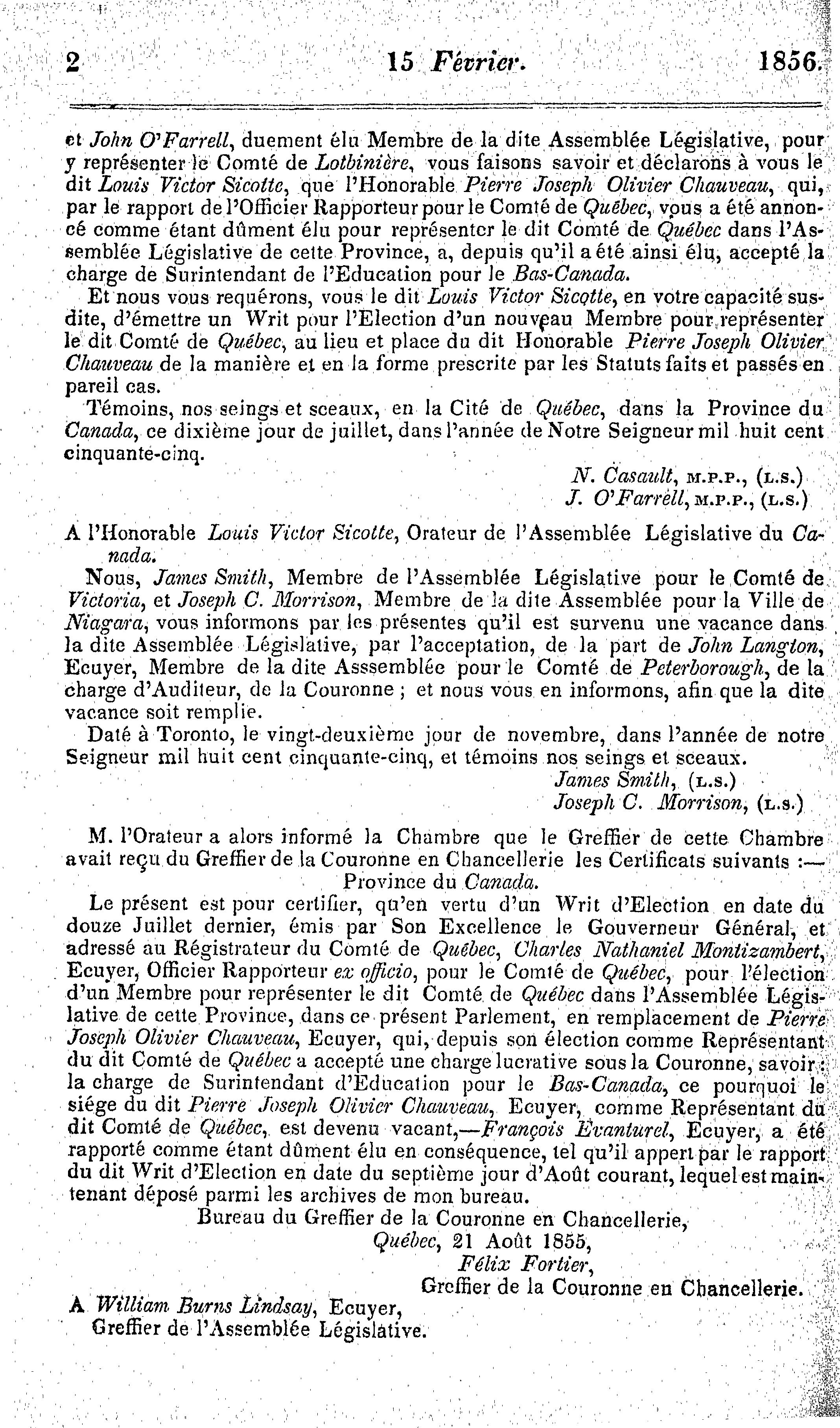 Journaux de l'Assemblée législative de la Province du Canada du 15 février au 1er juillet 1856, ces deux jours inclus, dans les dix-neuvième et vingtième années du règne de notre souveraine dame la Reine Victoria : étant la 2me session du 5me Parlement provincial du Canada : 1856
