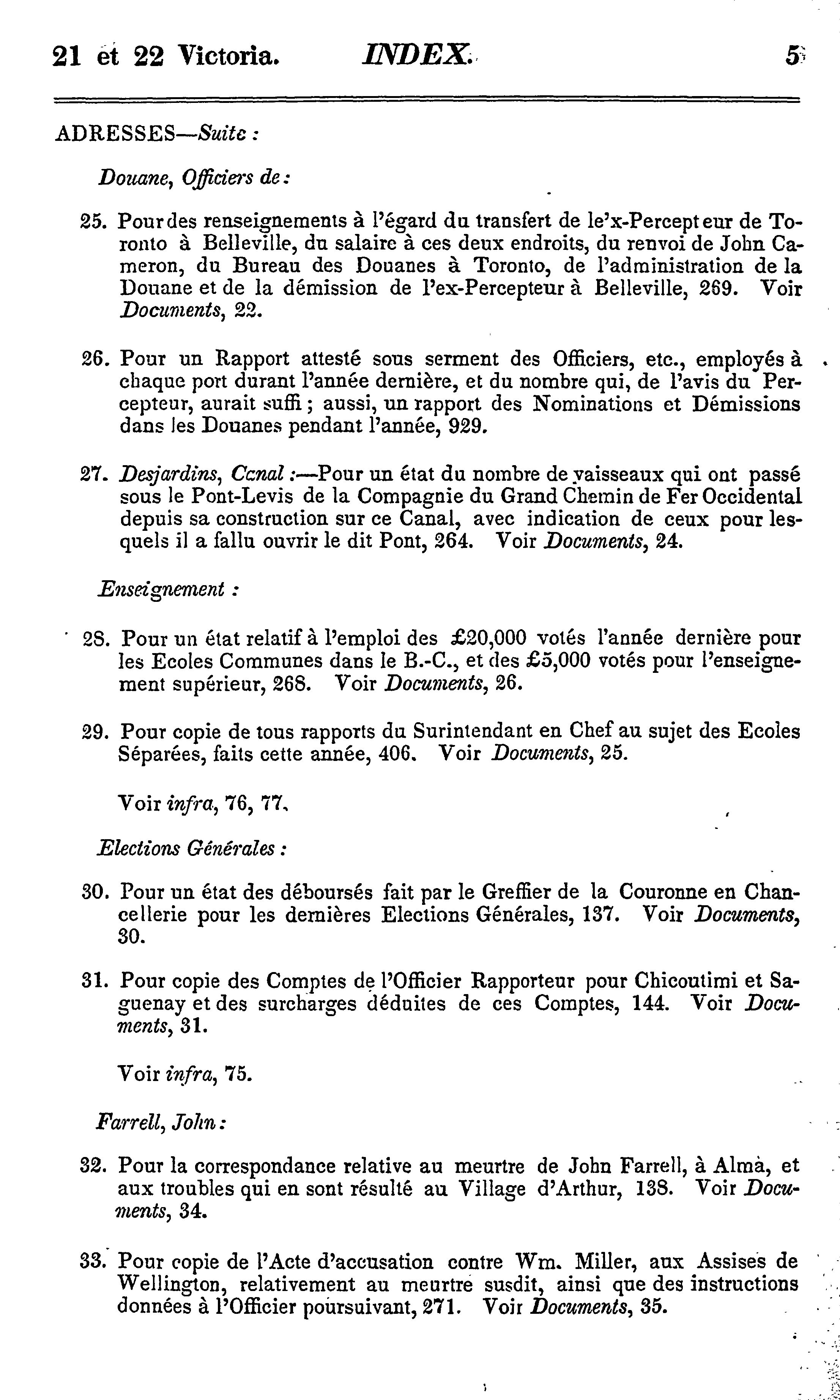 - Index et liste des appendices des journaux de l'Assemblée législative de la Province du Canada depuis le 25 février jusqu'au 16 août 1858, inclusivement, dans les vingt-unième et vingt-deuxième années du règne de notre souveraine dame la Reine Victoria : étant la 1re session du 6me Parlement provincial du Canada : 1858 (pt. 3)