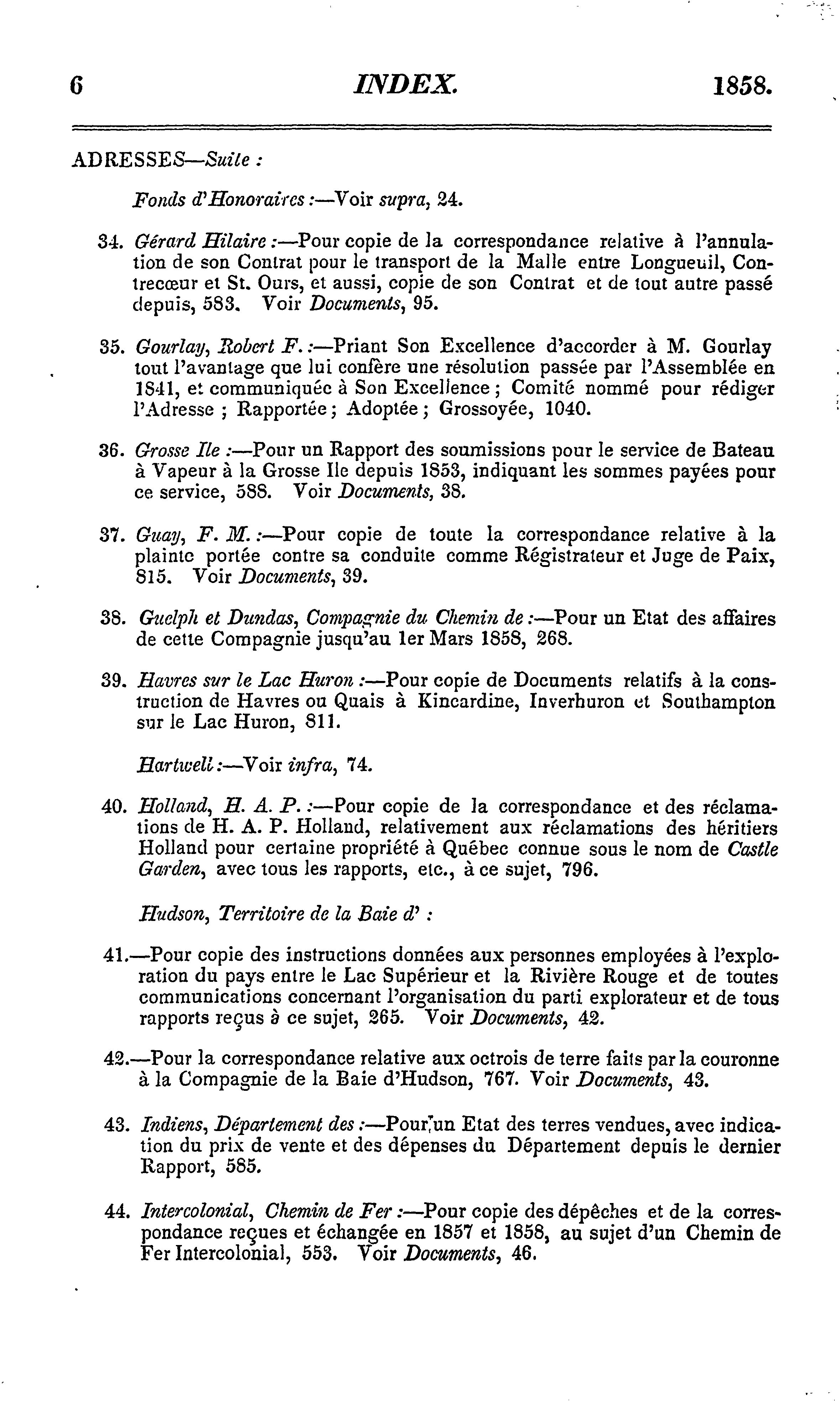 Index et liste des appendices des journaux de l'Assemblée législative de la Province du Canada depuis le 25 février jusqu'au 16 août 1858, inclusivement, dans les vingt-unième et vingt-deuxième années du règne de notre souveraine dame la Reine Victoria : étant la 1re session du 6me Parlement provincial du Canada : 1858 (pt. 3)