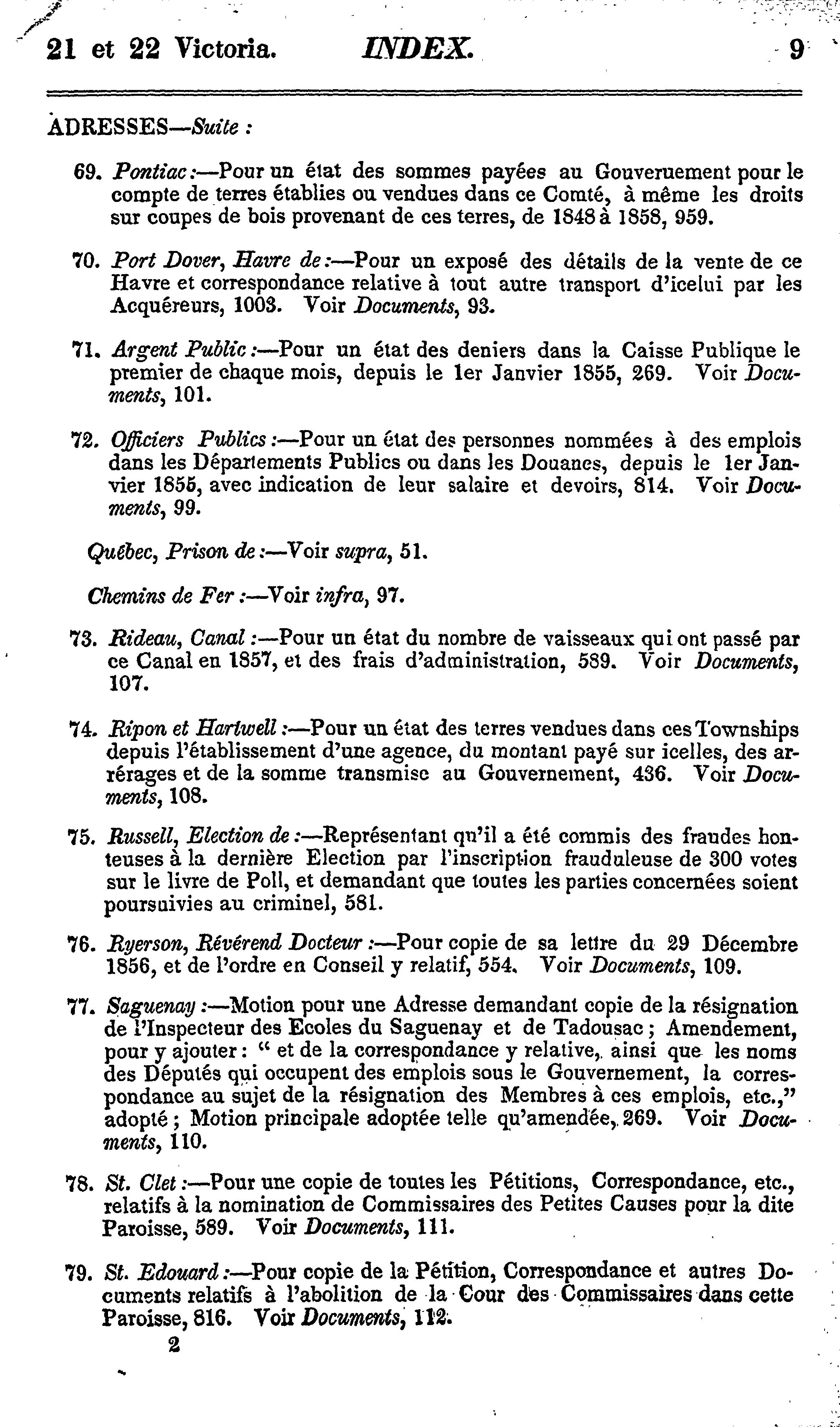 - Index et liste des appendices des journaux de l'Assemblée législative de la Province du Canada depuis le 25 février jusqu'au 16 août 1858, inclusivement, dans les vingt-unième et vingt-deuxième années du règne de notre souveraine dame la Reine Victoria : étant la 1re session du 6me Parlement provincial du Canada : 1858 (pt. 3)