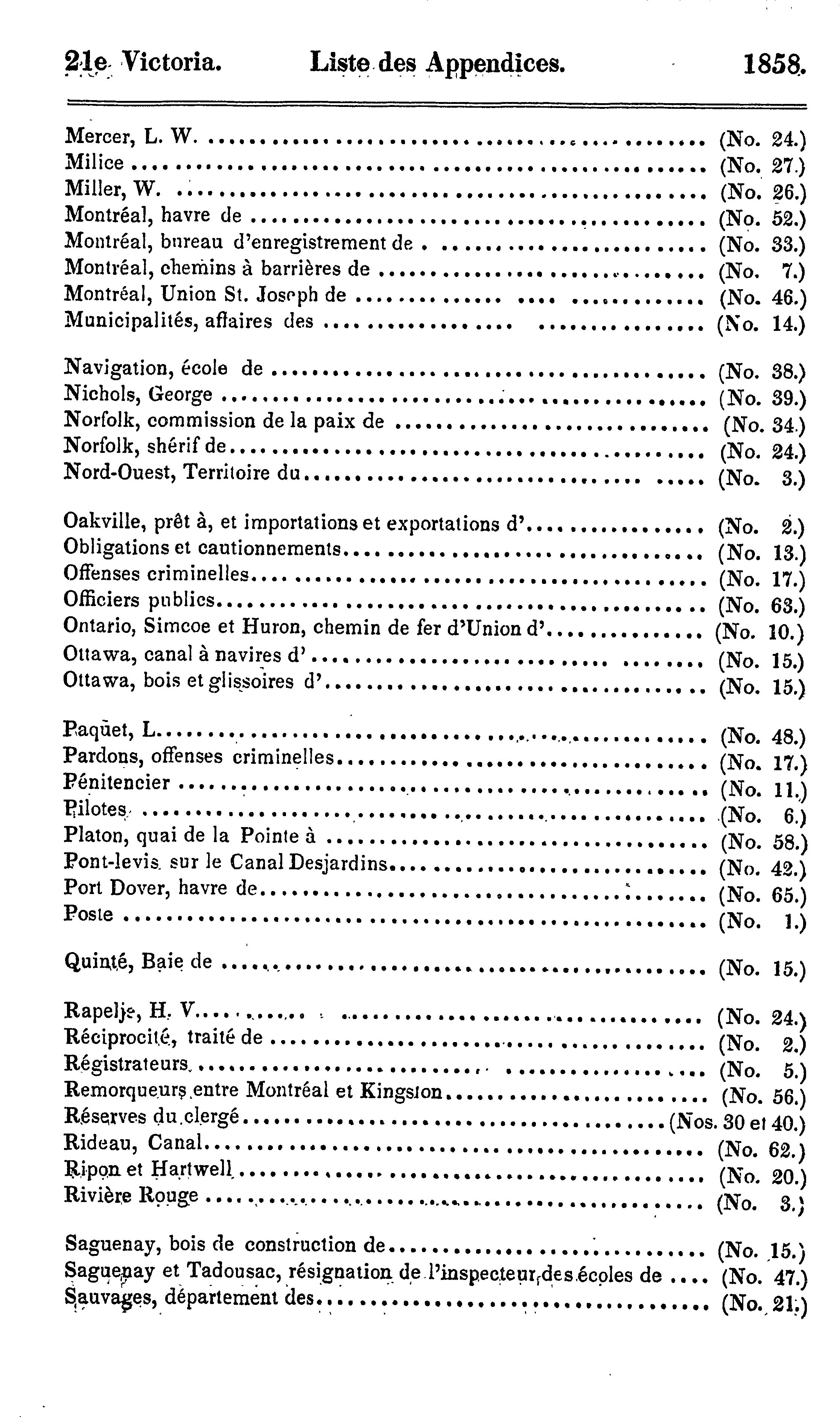 - Index et liste des appendices des journaux de l'Assemblée législative de la Province du Canada depuis le 25 février jusqu'au 16 août 1858, inclusivement, dans les vingt-unième et vingt-deuxième années du règne de notre souveraine dame la Reine Victoria : étant la 1re session du 6me Parlement provincial du Canada : 1858 (pt. 3)