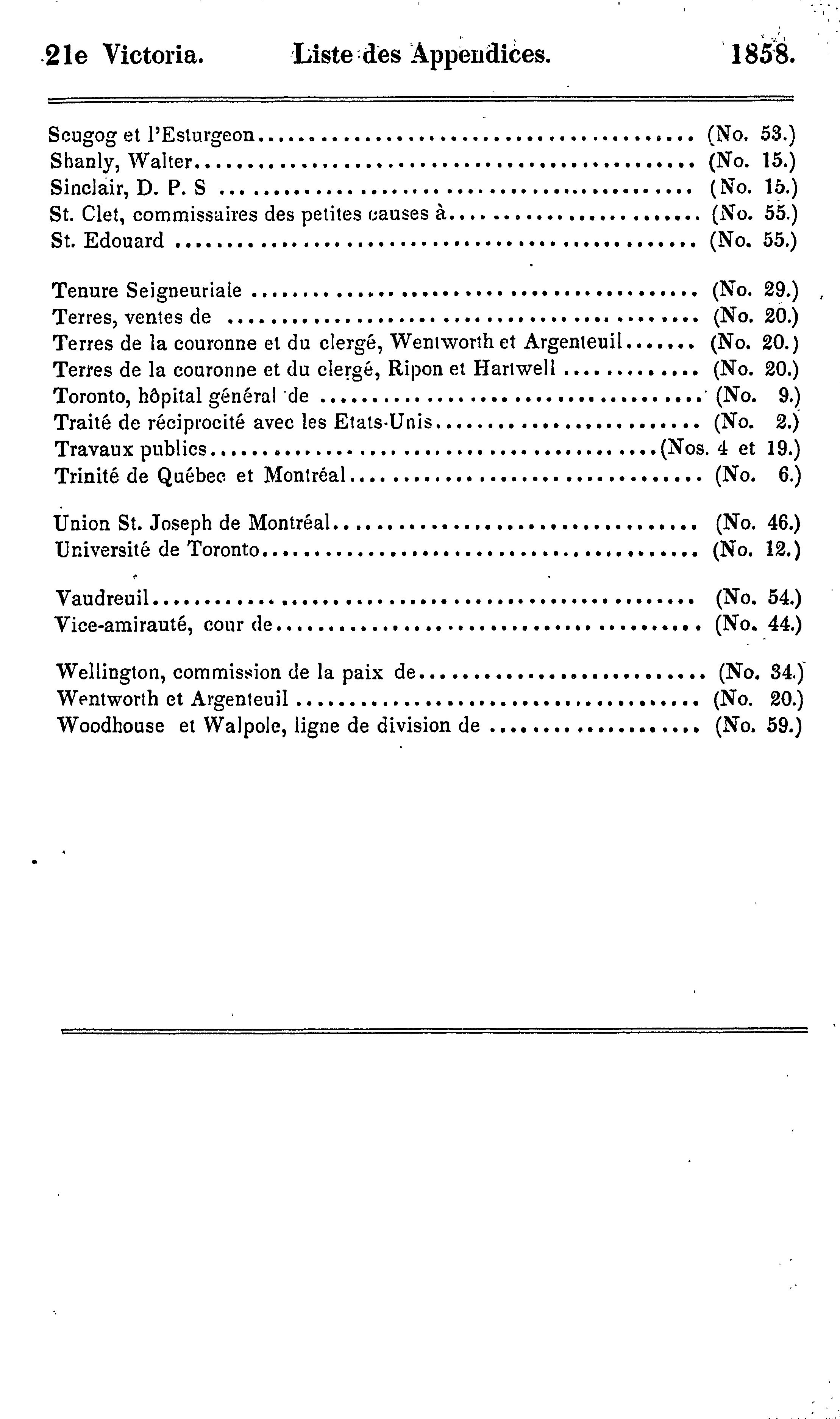 - Index et liste des appendices des journaux de l'Assemblée législative de la Province du Canada depuis le 25 février jusqu'au 16 août 1858, inclusivement, dans les vingt-unième et vingt-deuxième années du règne de notre souveraine dame la Reine Victoria : étant la 1re session du 6me Parlement provincial du Canada : 1858 (pt. 3)