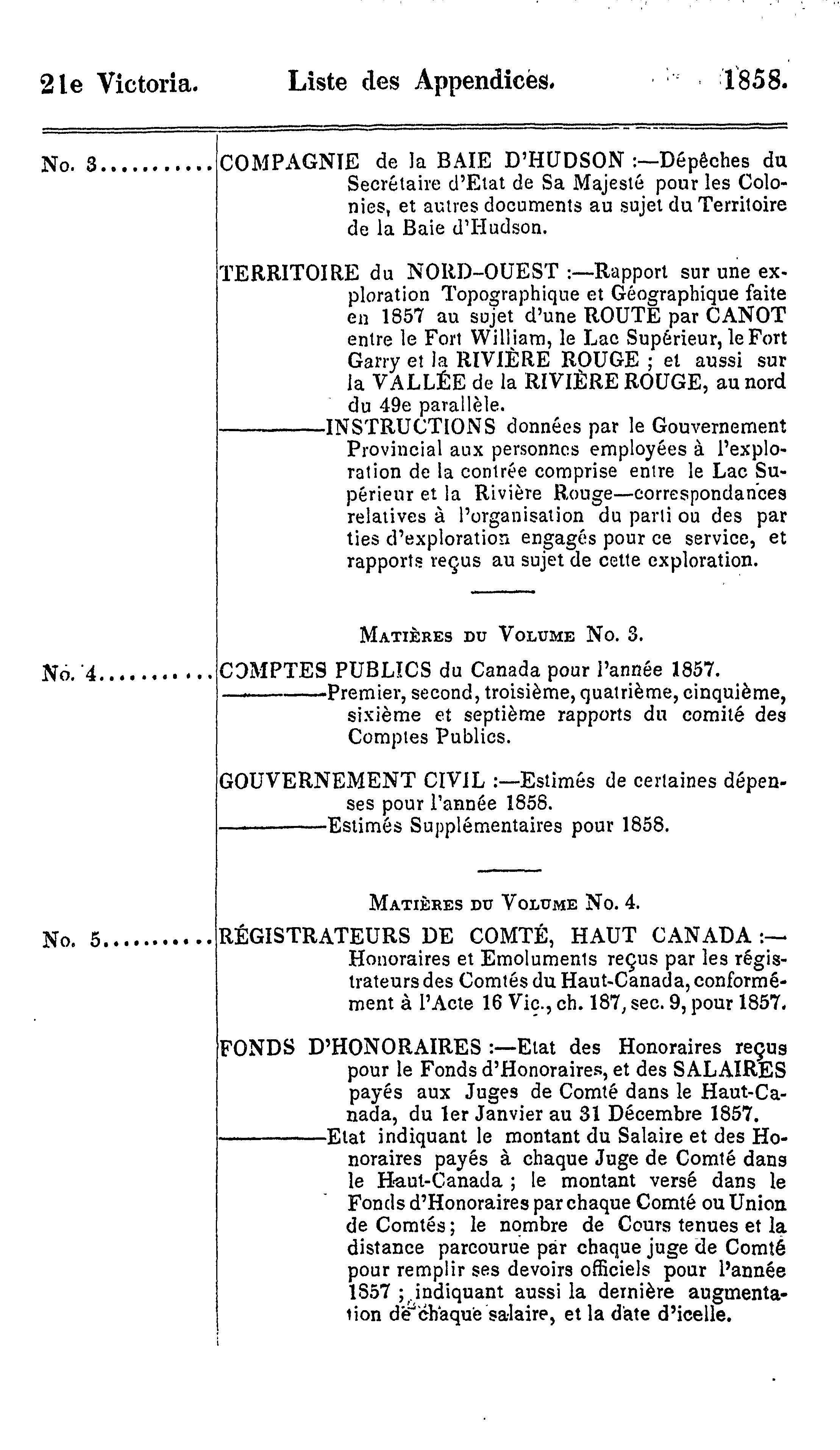 - Index et liste des appendices des journaux de l'Assemblée législative de la Province du Canada depuis le 25 février jusqu'au 16 août 1858, inclusivement, dans les vingt-unième et vingt-deuxième années du règne de notre souveraine dame la Reine Victoria : étant la 1re session du 6me Parlement provincial du Canada : 1858 (pt. 3)