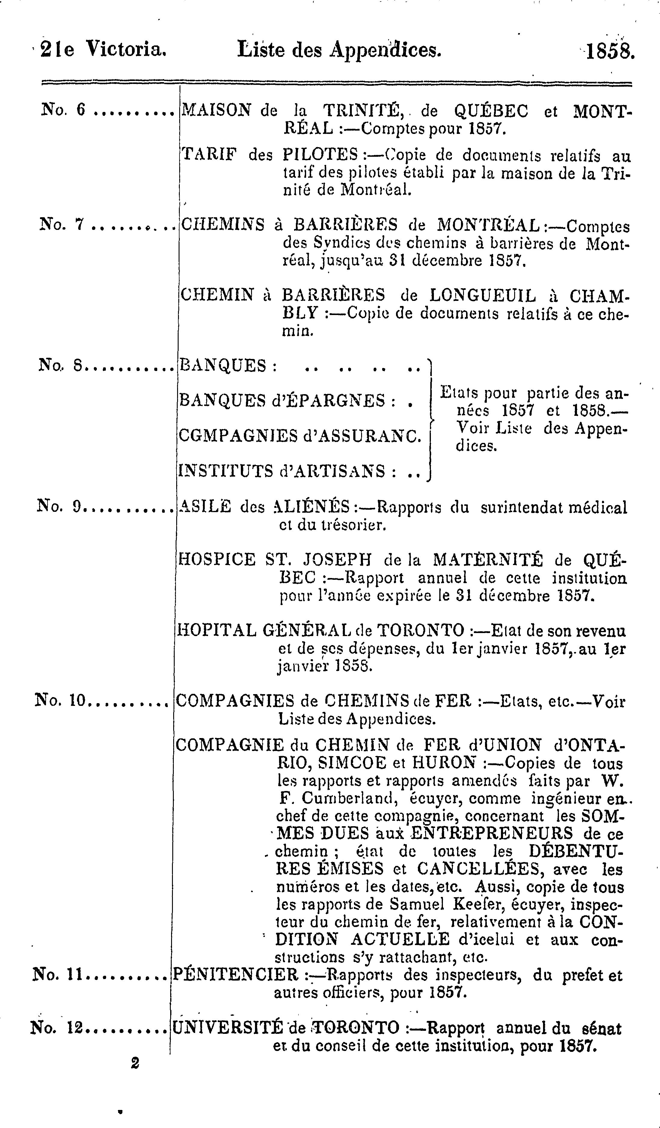 - Index et liste des appendices des journaux de l'Assemblée législative de la Province du Canada depuis le 25 février jusqu'au 16 août 1858, inclusivement, dans les vingt-unième et vingt-deuxième années du règne de notre souveraine dame la Reine Victoria : étant la 1re session du 6me Parlement provincial du Canada : 1858 (pt. 3)