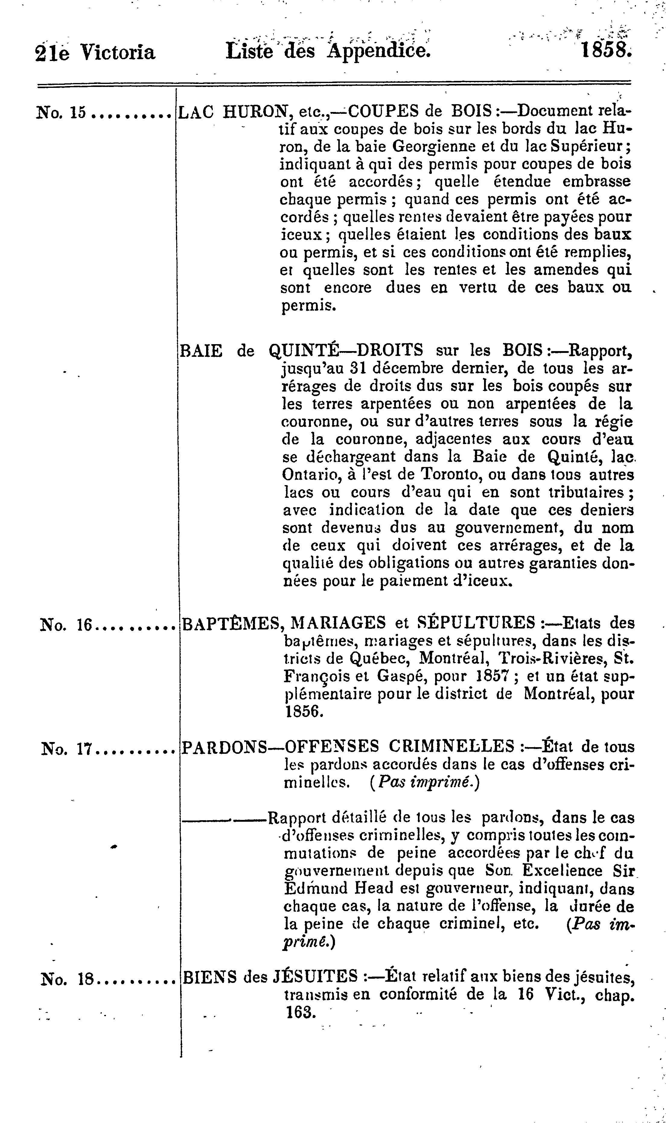 - Index et liste des appendices des journaux de l'Assemblée législative de la Province du Canada depuis le 25 février jusqu'au 16 août 1858, inclusivement, dans les vingt-unième et vingt-deuxième années du règne de notre souveraine dame la Reine Victoria : étant la 1re session du 6me Parlement provincial du Canada : 1858 (pt. 3)