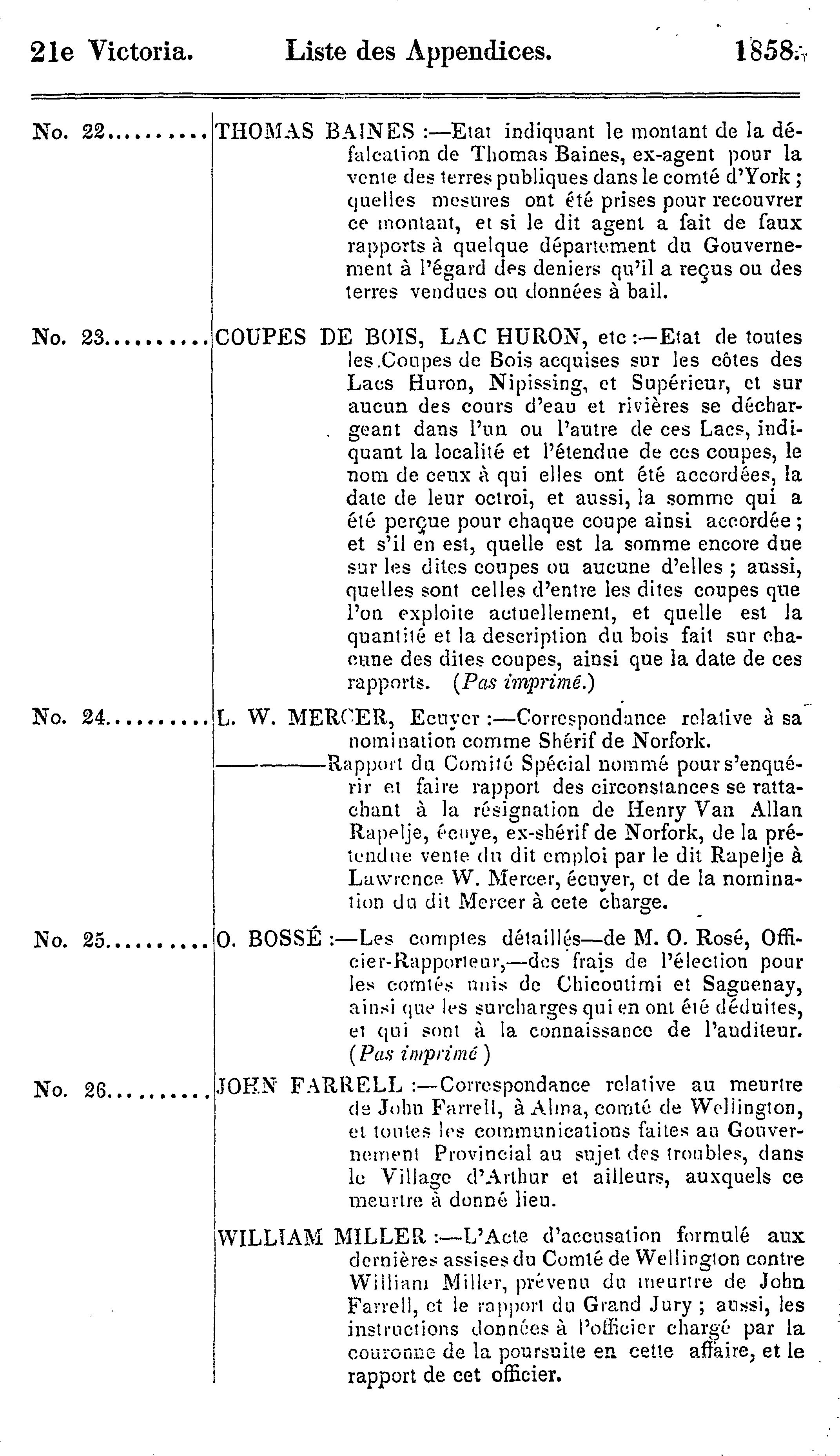 - Index et liste des appendices des journaux de l'Assemblée législative de la Province du Canada depuis le 25 février jusqu'au 16 août 1858, inclusivement, dans les vingt-unième et vingt-deuxième années du règne de notre souveraine dame la Reine Victoria : étant la 1re session du 6me Parlement provincial du Canada : 1858 (pt. 3)