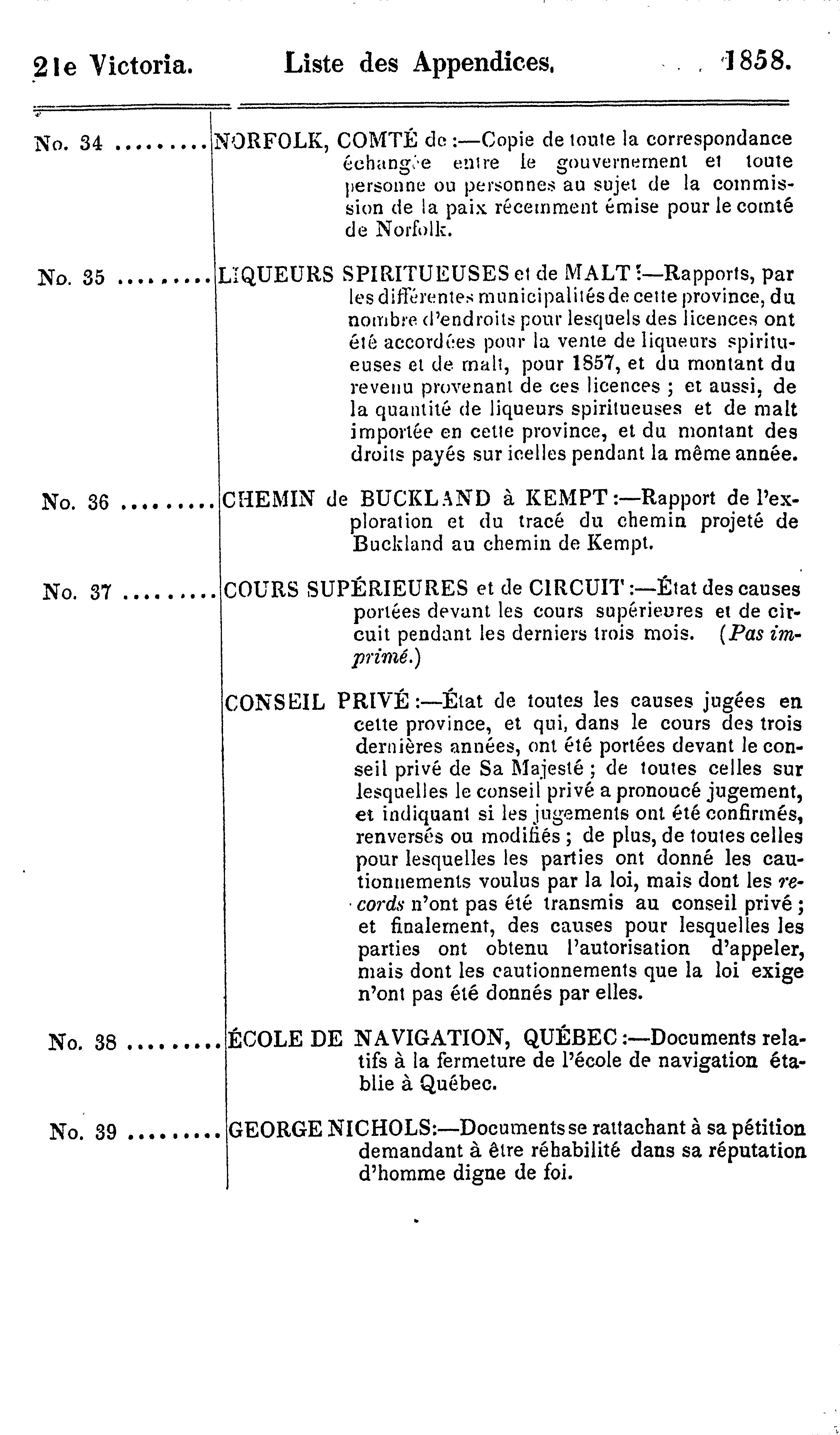 Index et liste des appendices des journaux de l'Assemblée législative de la Province du Canada depuis le 25 février jusqu'au 16 août 1858, inclusivement, dans les vingt-unième et vingt-deuxième années du règne de notre souveraine dame la Reine Victoria : étant la 1re session du 6me Parlement provincial du Canada : 1858 (pt. 3)
