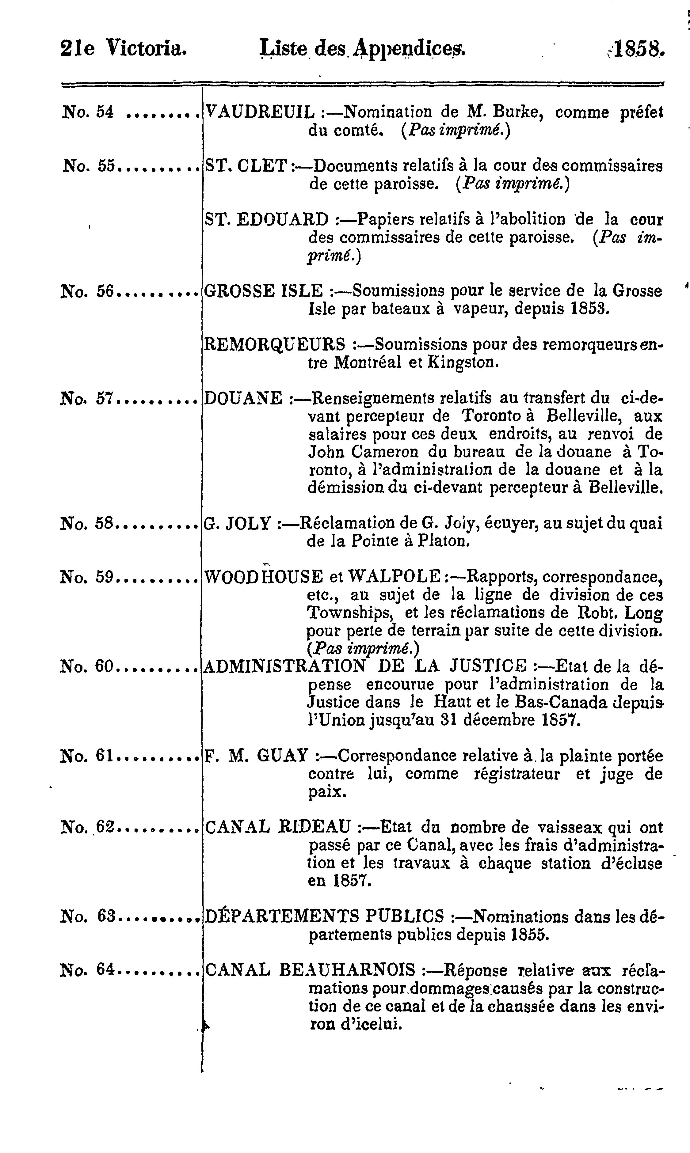 - Index et liste des appendices des journaux de l'Assemblée législative de la Province du Canada depuis le 25 février jusqu'au 16 août 1858, inclusivement, dans les vingt-unième et vingt-deuxième années du règne de notre souveraine dame la Reine Victoria : étant la 1re session du 6me Parlement provincial du Canada : 1858 (pt. 3)