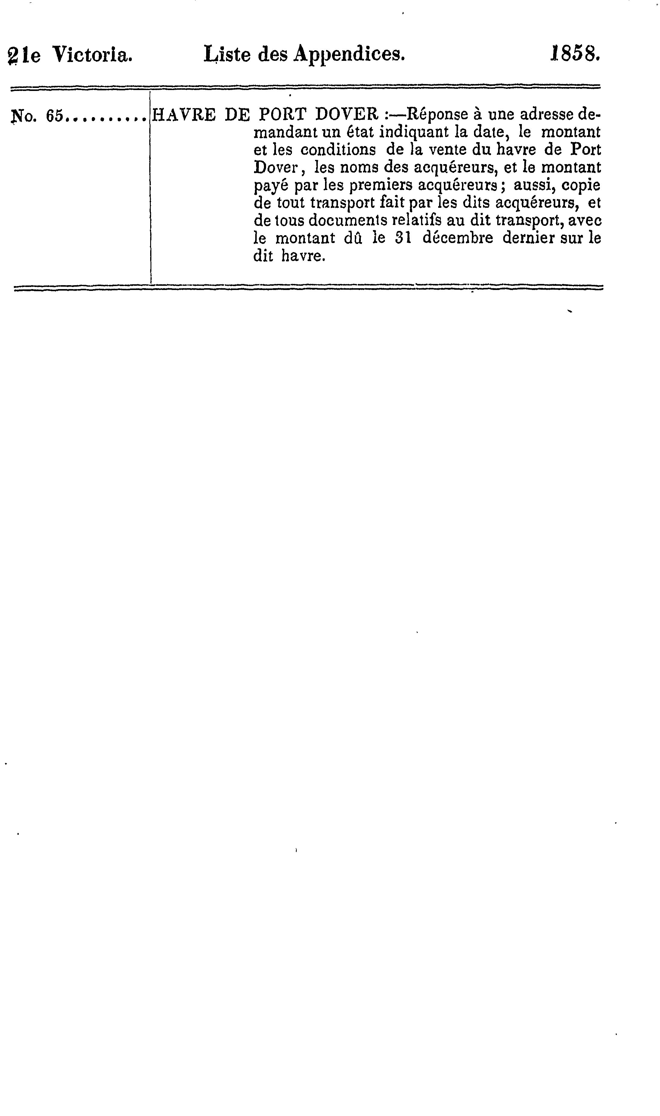 Index et liste des appendices des journaux de l'Assemblée législative de la Province du Canada depuis le 25 février jusqu'au 16 août 1858, inclusivement, dans les vingt-unième et vingt-deuxième années du règne de notre souveraine dame la Reine Victoria : étant la 1re session du 6me Parlement provincial du Canada : 1858 (pt. 3)