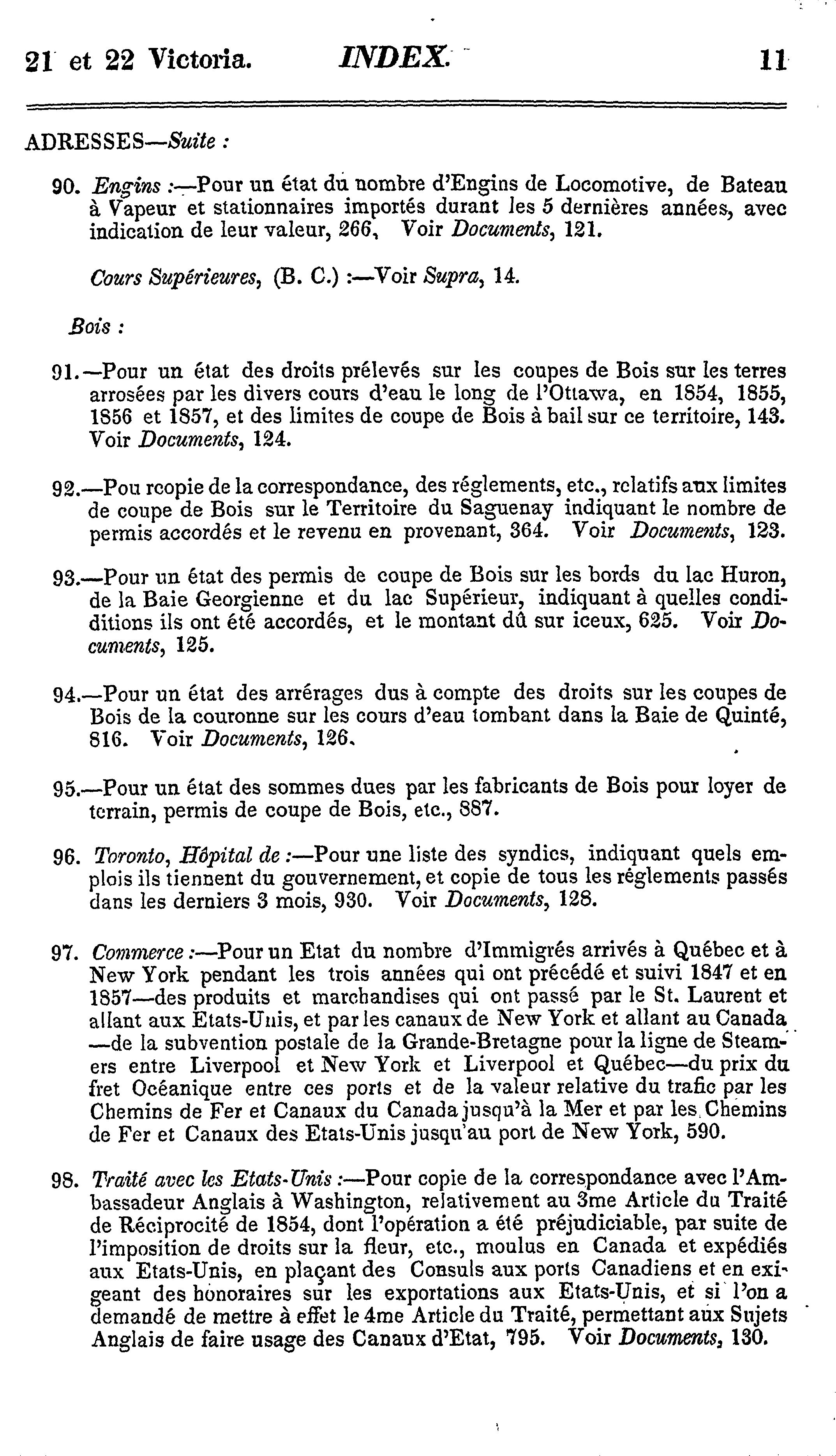 - Index et liste des appendices des journaux de l'Assemblée législative de la Province du Canada depuis le 25 février jusqu'au 16 août 1858, inclusivement, dans les vingt-unième et vingt-deuxième années du règne de notre souveraine dame la Reine Victoria : étant la 1re session du 6me Parlement provincial du Canada : 1858 (pt. 3)