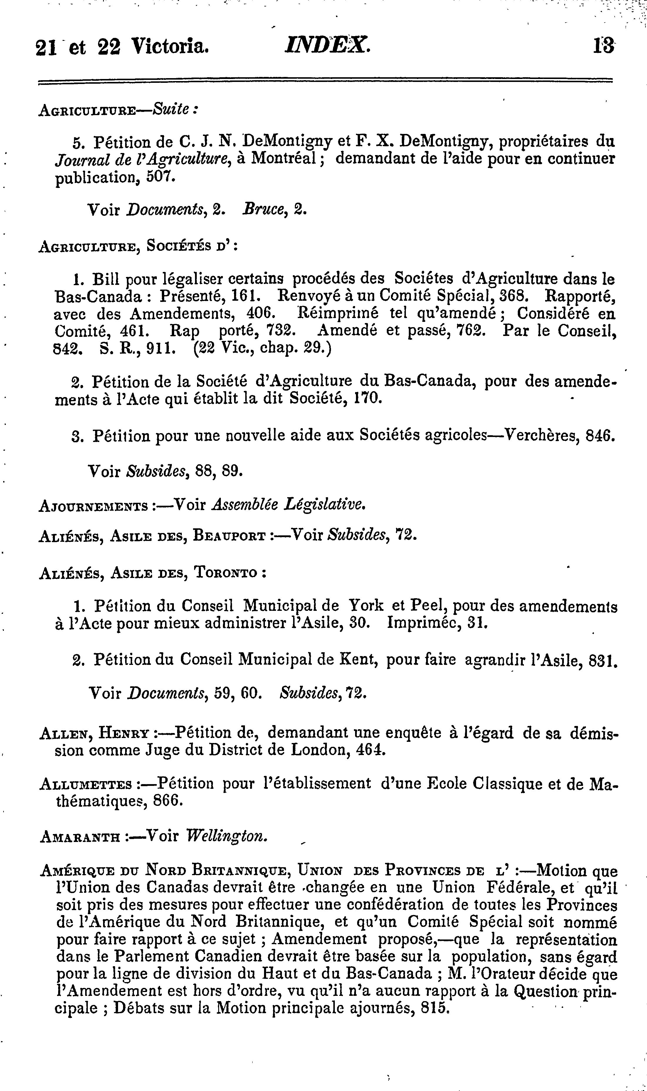 Index et liste des appendices des journaux de l'Assemblée législative de la Province du Canada depuis le 25 février jusqu'au 16 août 1858, inclusivement, dans les vingt-unième et vingt-deuxième années du règne de notre souveraine dame la Reine Victoria : étant la 1re session du 6me Parlement provincial du Canada : 1858 (pt. 3)