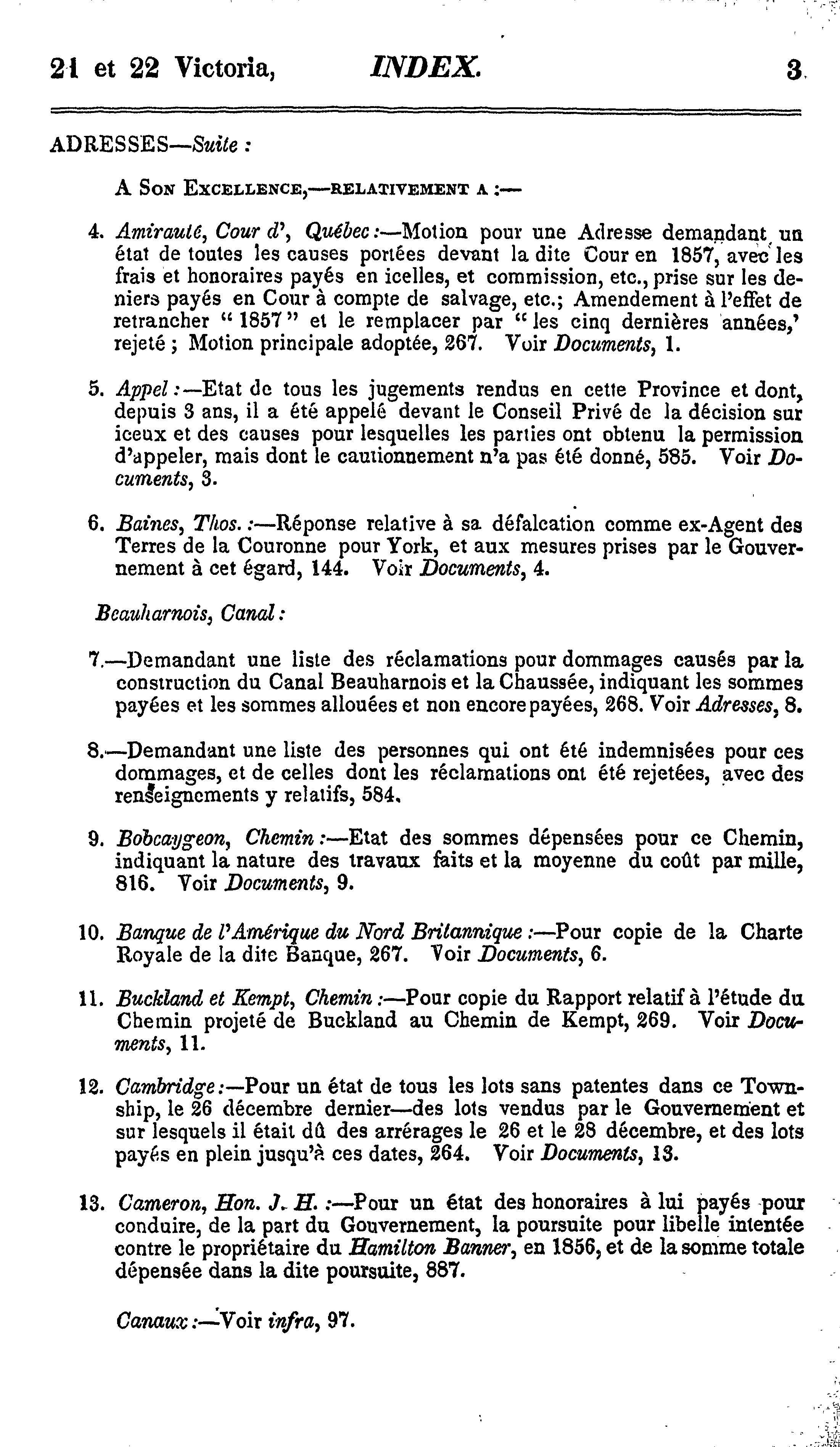 - Index et liste des appendices des journaux de l'Assemblée législative de la Province du Canada depuis le 25 février jusqu'au 16 août 1858, inclusivement, dans les vingt-unième et vingt-deuxième années du règne de notre souveraine dame la Reine Victoria : étant la 1re session du 6me Parlement provincial du Canada : 1858 (pt. 3)