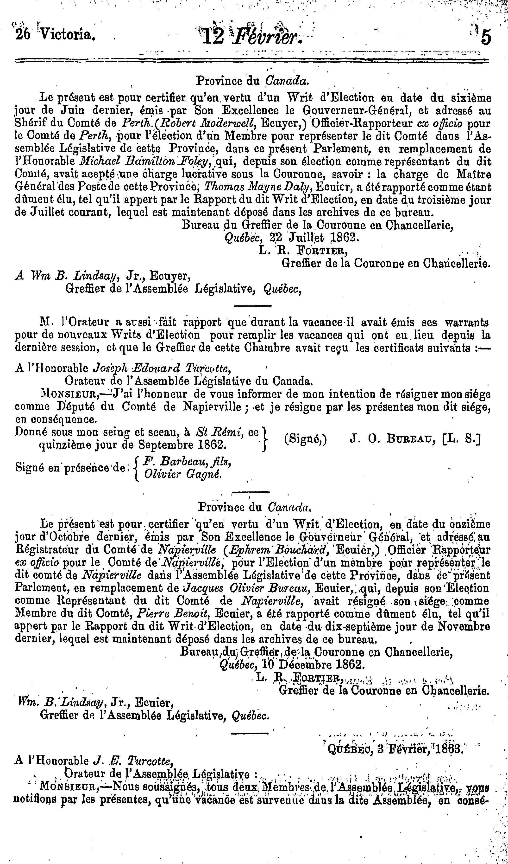 Journaux de l'Assemblée législative de la Province du Canada du 12 février au 12 mai 1863, les deux jours inclusivement, dans la vingt-sixième année du règne de notre souveraine dame la Reine Victoria : étant la 2e session du 7e Parlement provincial du Canada : 1863
