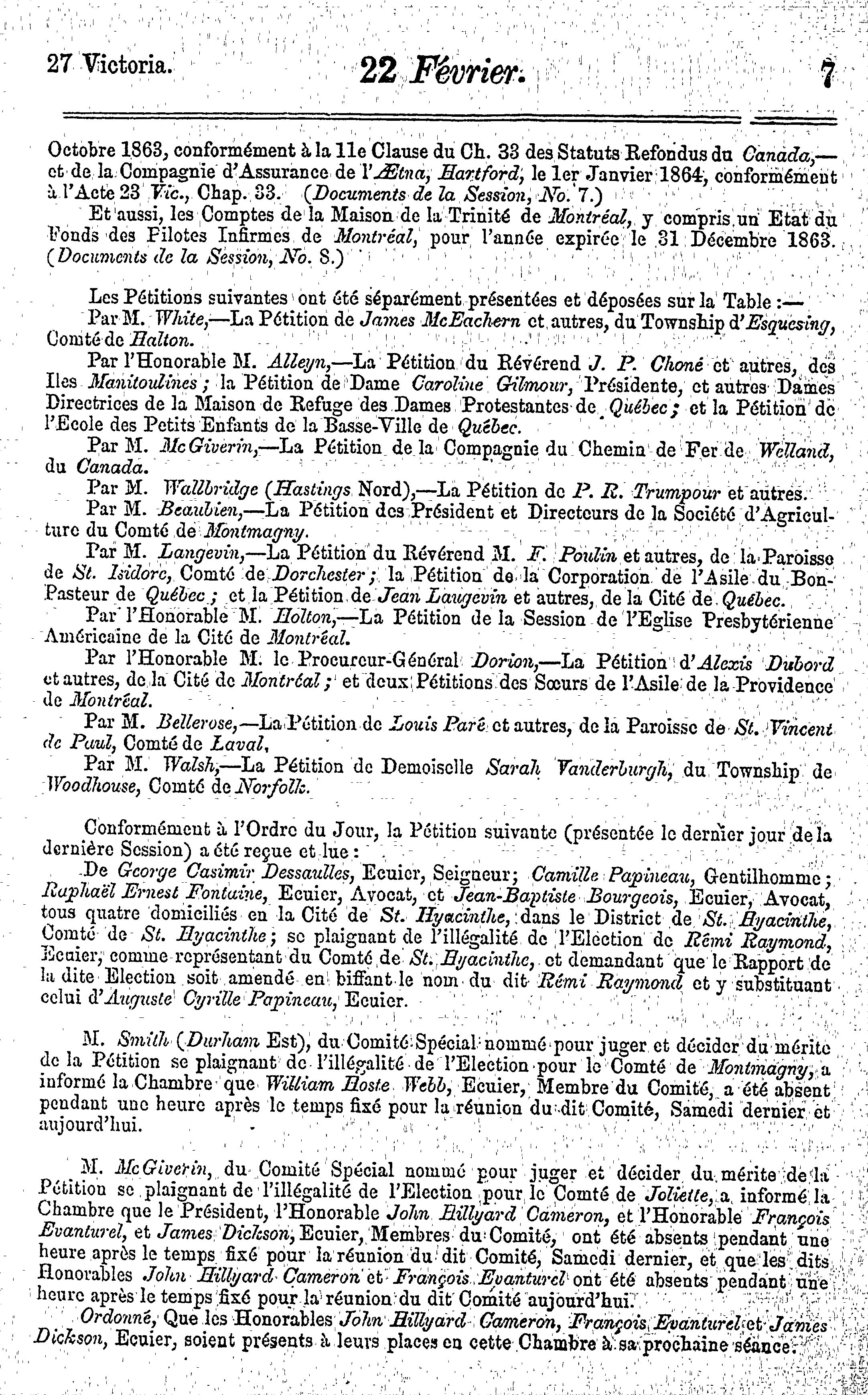 Journaux de l'Assemblée législative de la Province du Canada du 13 février au 30 juin 1864, inclusivement, dans les vingt-septième et vingt-huitième années du règne de notre souveraine dame la Reine Victoria : étant la 2me session du 8me Parlement provincial du Canada : 1864