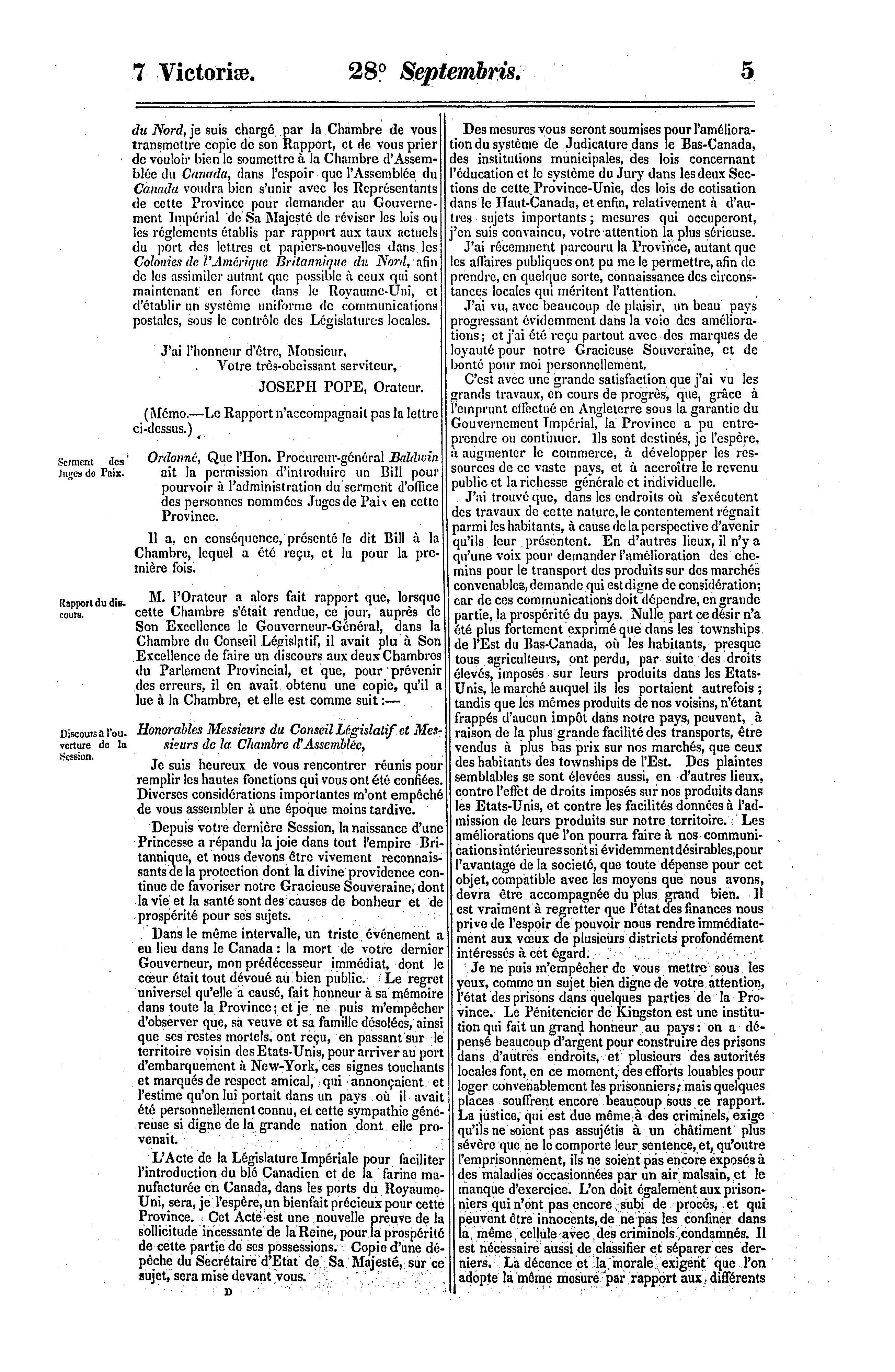 - Journaux de l'Assemblée législative de la Province du Canada, du 28 septembre au 9 décembre, de l'année de notre seigneur 1843 et dans la septième année du règne de notre Souveraine la Reine Victoria, troisième session du premier Parlement provincial du Canada : 1843