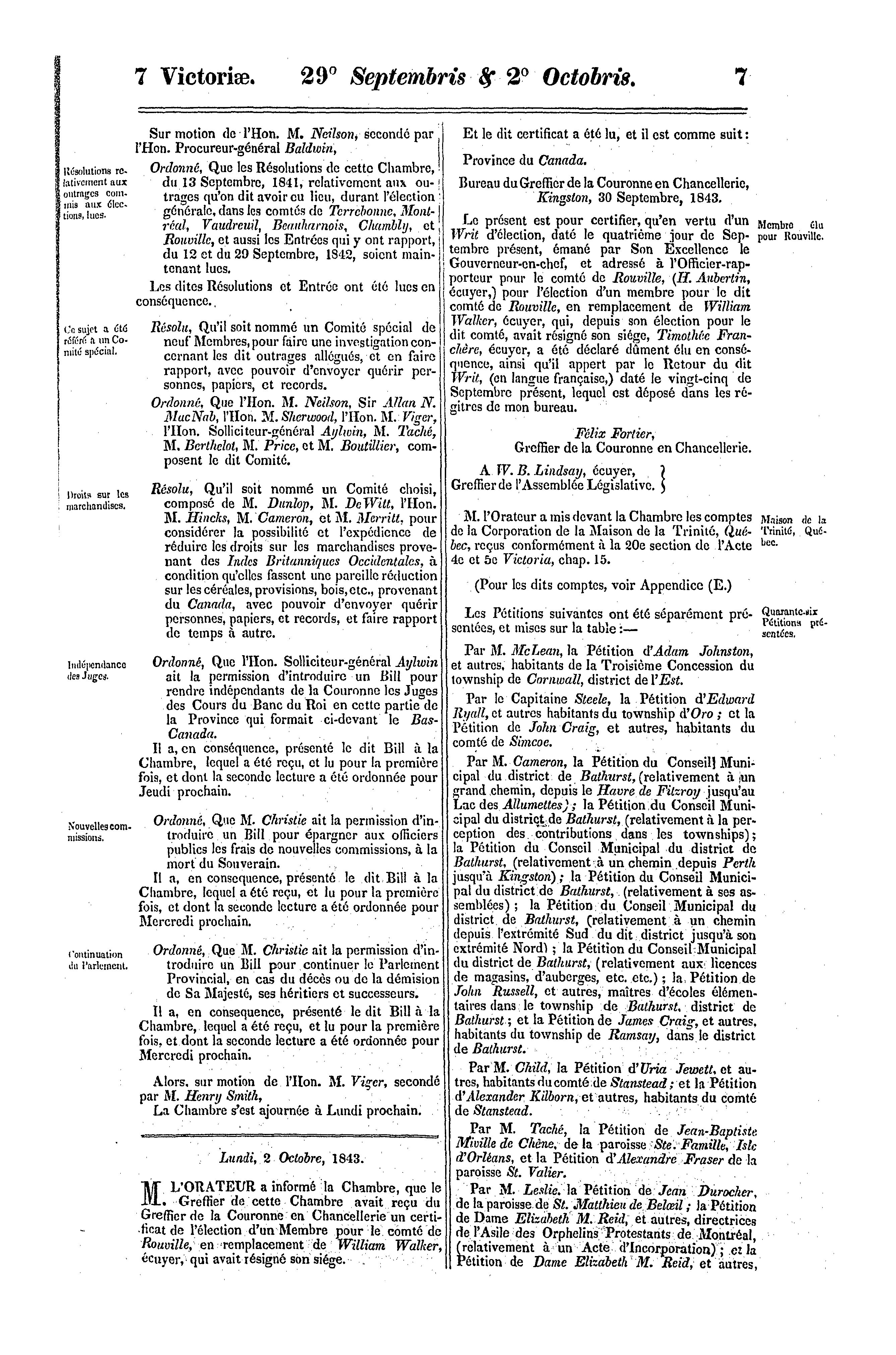 - Journaux de l'Assemblée législative de la Province du Canada, du 28 septembre au 9 décembre, de l'année de notre seigneur 1843 et dans la septième année du règne de notre Souveraine la Reine Victoria, troisième session du premier Parlement provincial du Canada : 1843