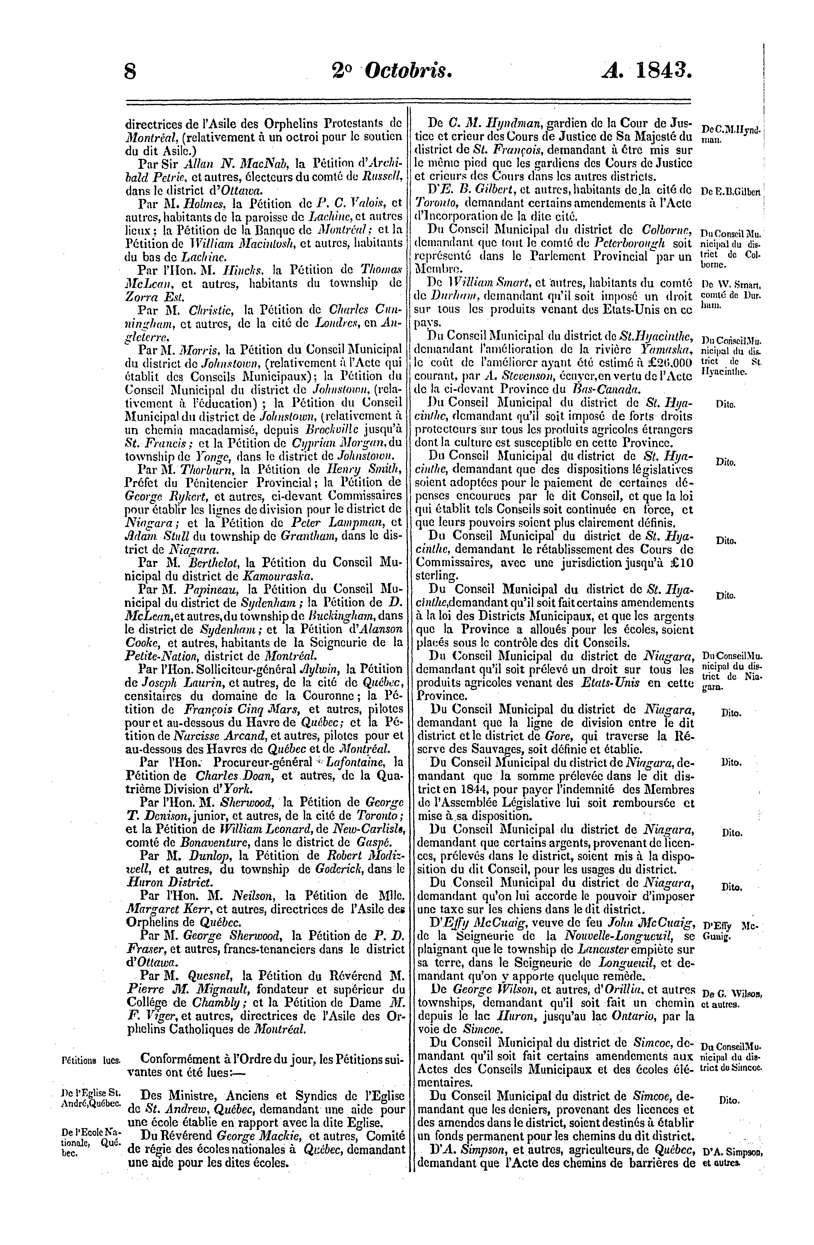 - Journaux de l'Assemblée législative de la Province du Canada, du 28 septembre au 9 décembre, de l'année de notre seigneur 1843 et dans la septième année du règne de notre Souveraine la Reine Victoria, troisième session du premier Parlement provincial du Canada : 1843