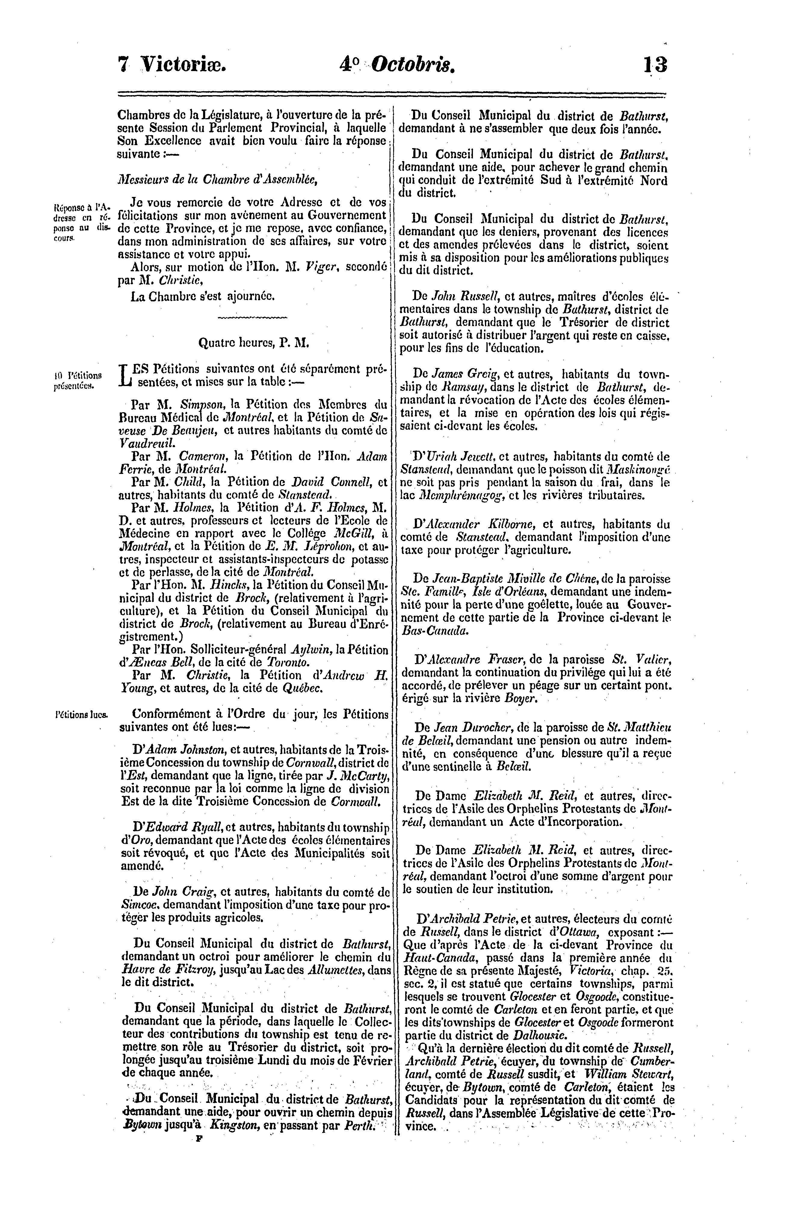 - Journaux de l'Assemblée législative de la Province du Canada, du 28 septembre au 9 décembre, de l'année de notre seigneur 1843 et dans la septième année du règne de notre Souveraine la Reine Victoria, troisième session du premier Parlement provincial du Canada : 1843