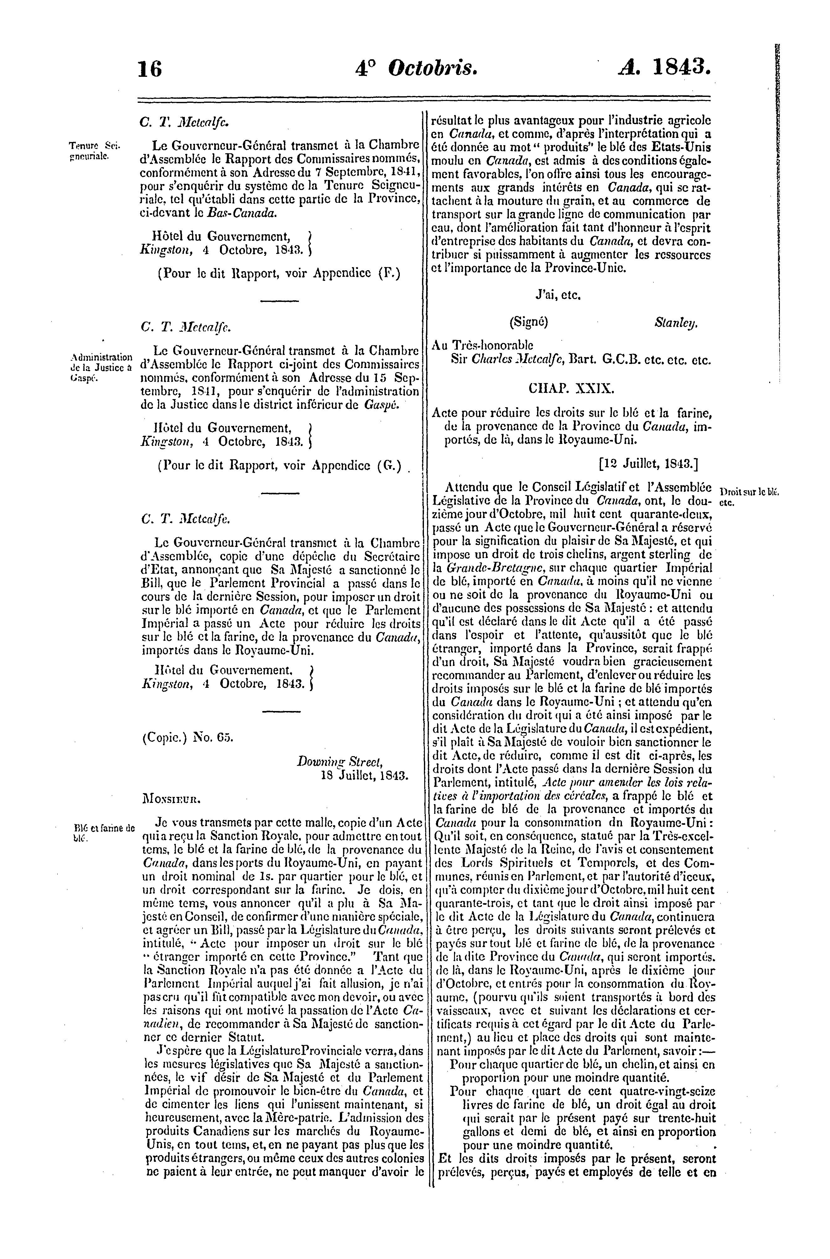 Journaux de l'Assemblée législative de la Province du Canada, du 28 septembre au 9 décembre, de l'année de notre seigneur 1843 et dans la septième année du règne de notre Souveraine la Reine Victoria, troisième session du premier Parlement provincial du Canada : 1843