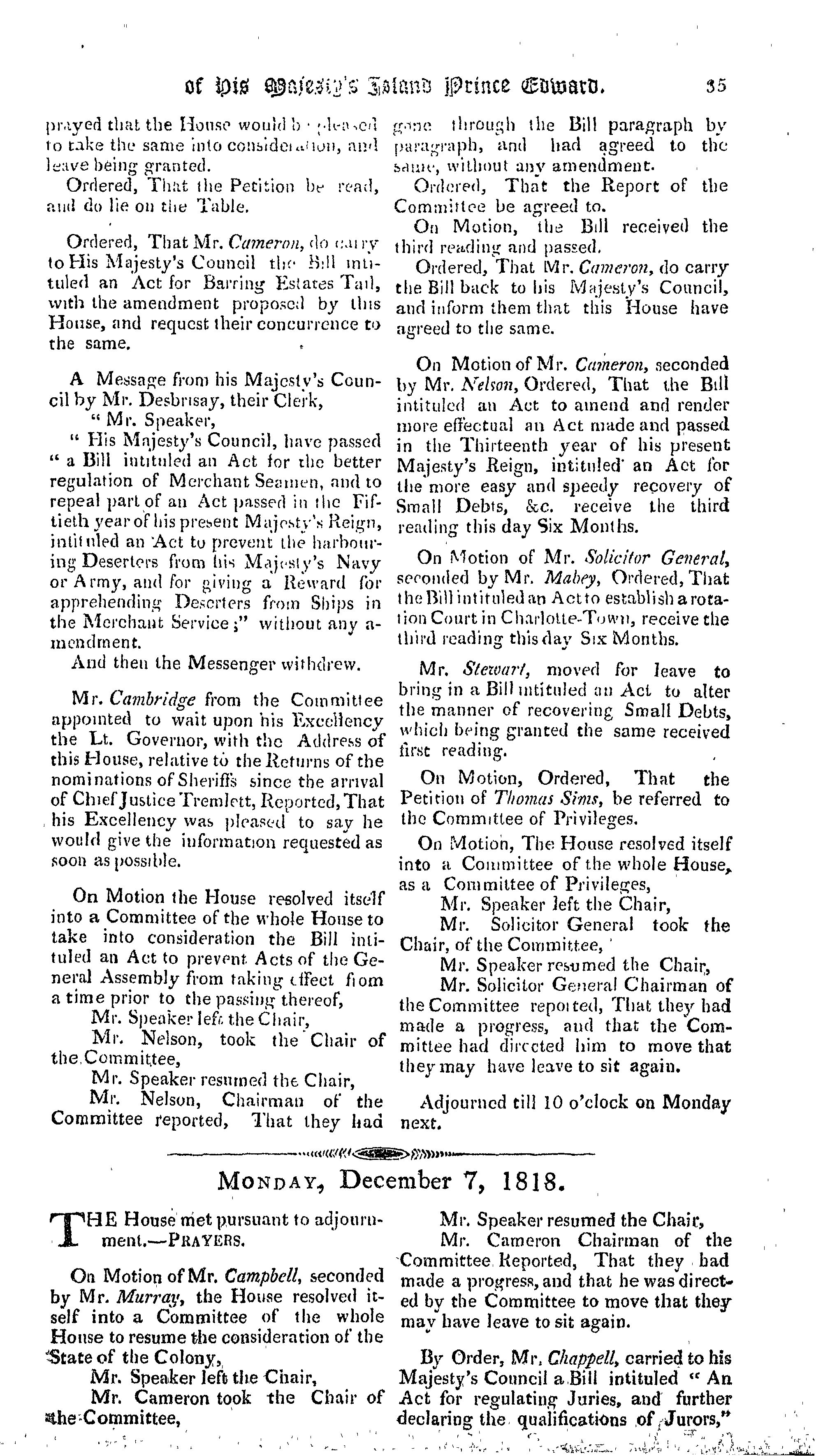 - Journal of the House of Assembly of His Majesty's Island Prince Edward : anno quinquagesimo nono, Regis Georgii III, first session of the tenth General Assembly : 1818/1819