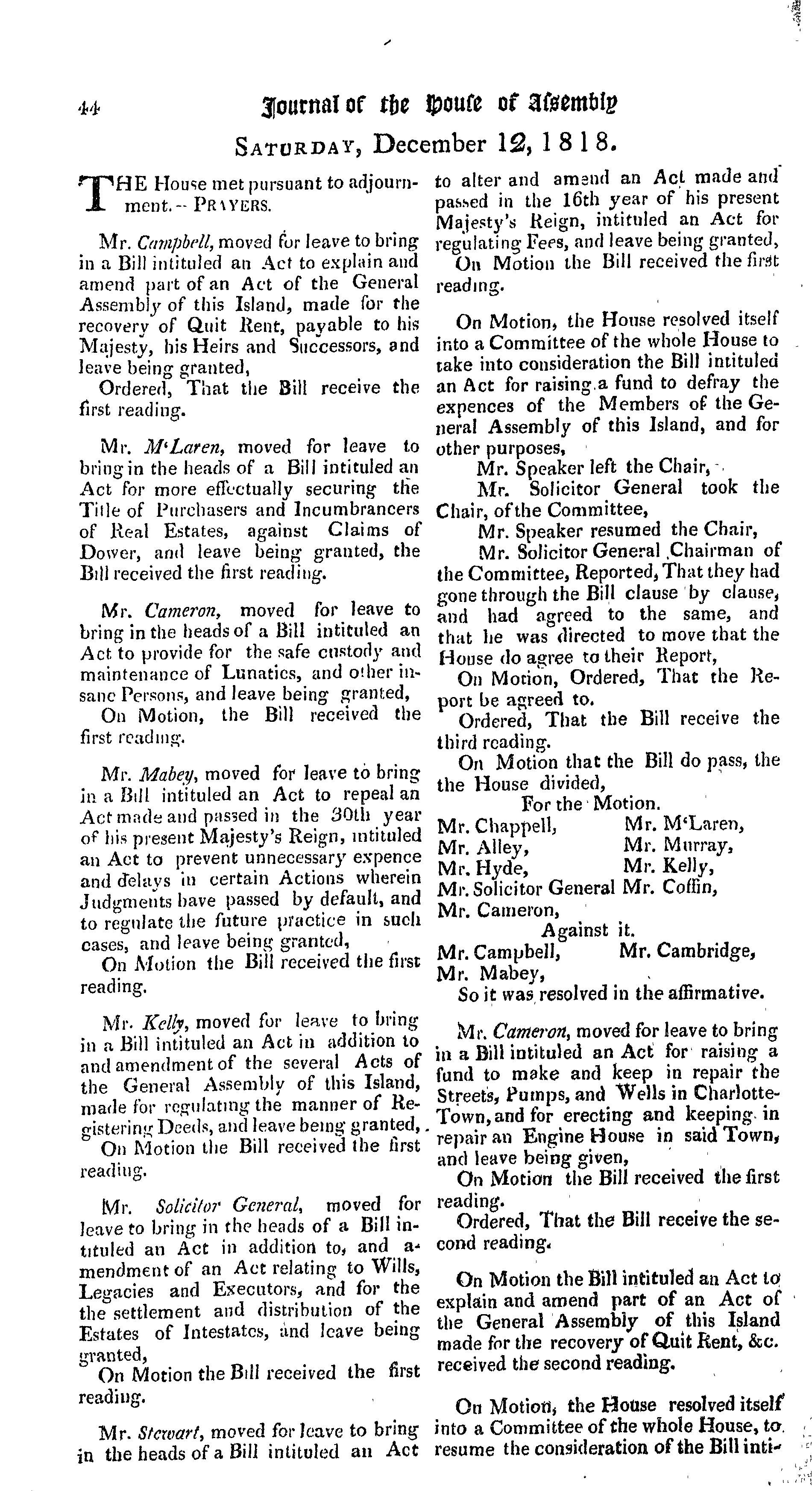 - Journal of the House of Assembly of His Majesty's Island Prince Edward : anno quinquagesimo nono, Regis Georgii III, first session of the tenth General Assembly : 1818/1819