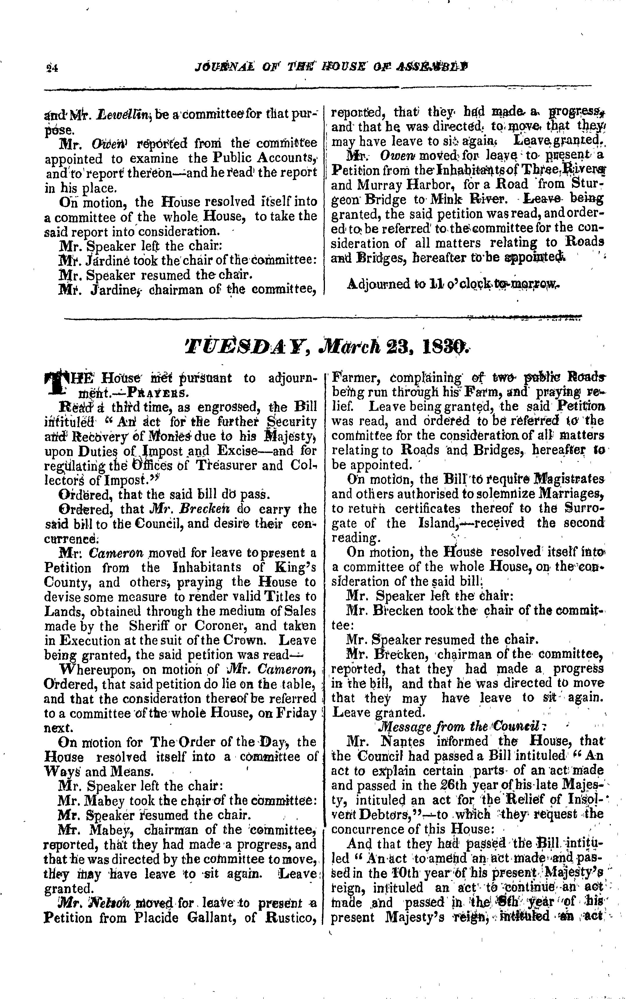 - Journal of the House of Assembly of His Majesty's Island Prince Edward : anno undecimo Regis Georgii IV, sixth session of the twelfth General Assembly : 1830