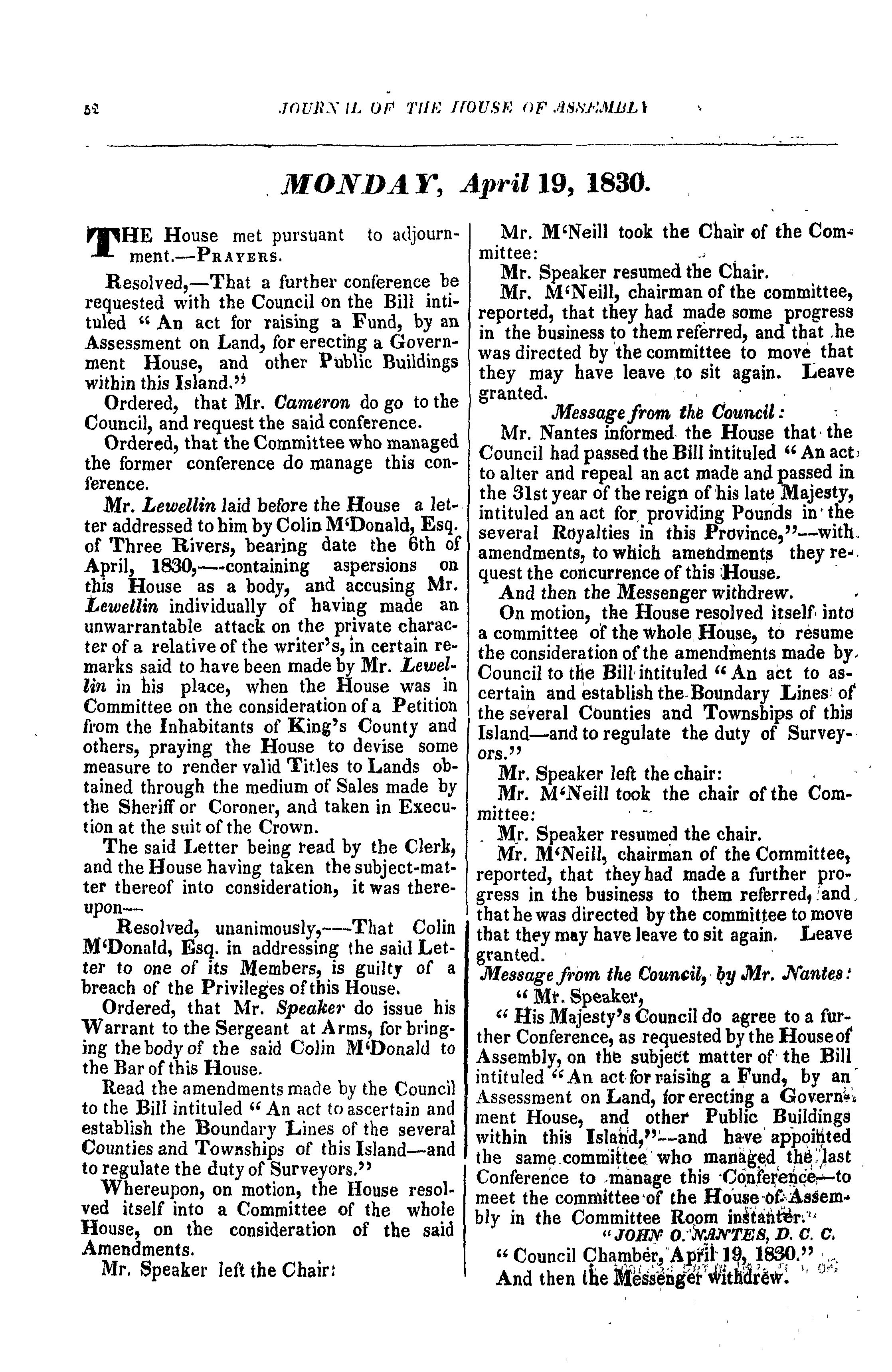 Journal of the House of Assembly of Prince Edward Island ... : Journal of the House of Assembly of His Majesty's Island Prince Edward : anno undecimo Regis Georgii IV, sixth session of the twelfth General Assembly : 1830