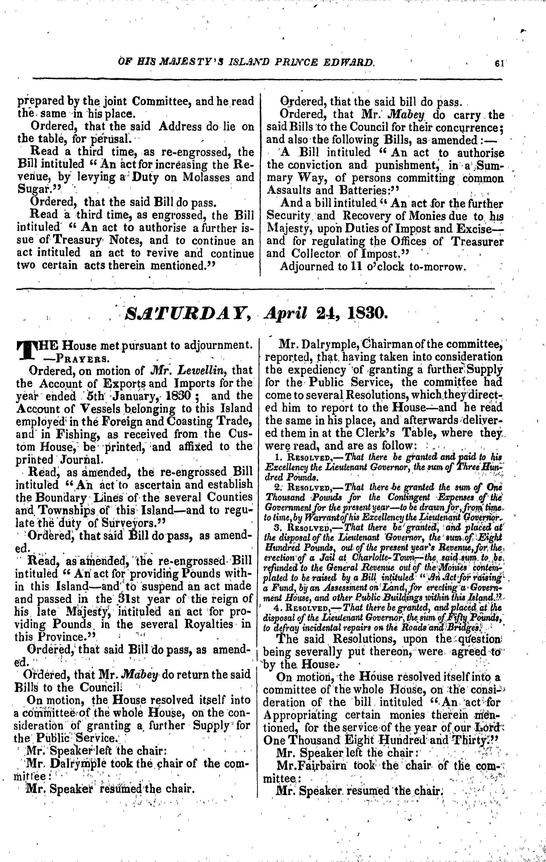 - Journal of the House of Assembly of His Majesty's Island Prince Edward : anno undecimo Regis Georgii IV, sixth session of the twelfth General Assembly : 1830