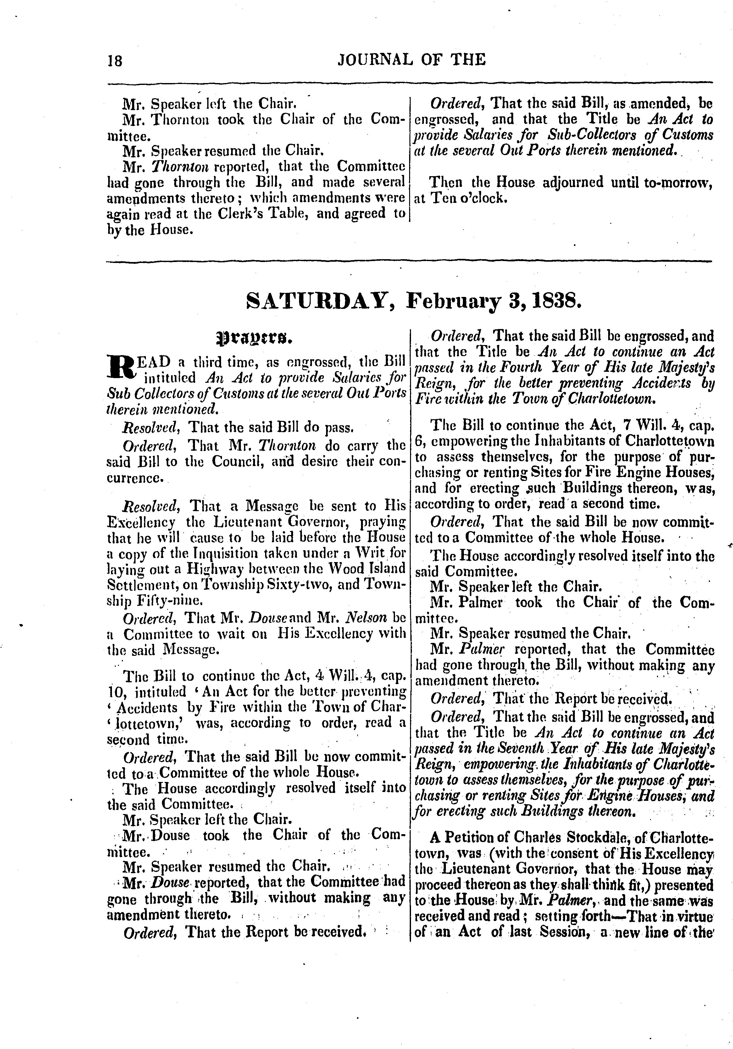 Journal of the House of Assembly of Prince Edward Island : anno primo Victoriæ Reginæ, fifth session of the fourteenth General Assembly : 1838