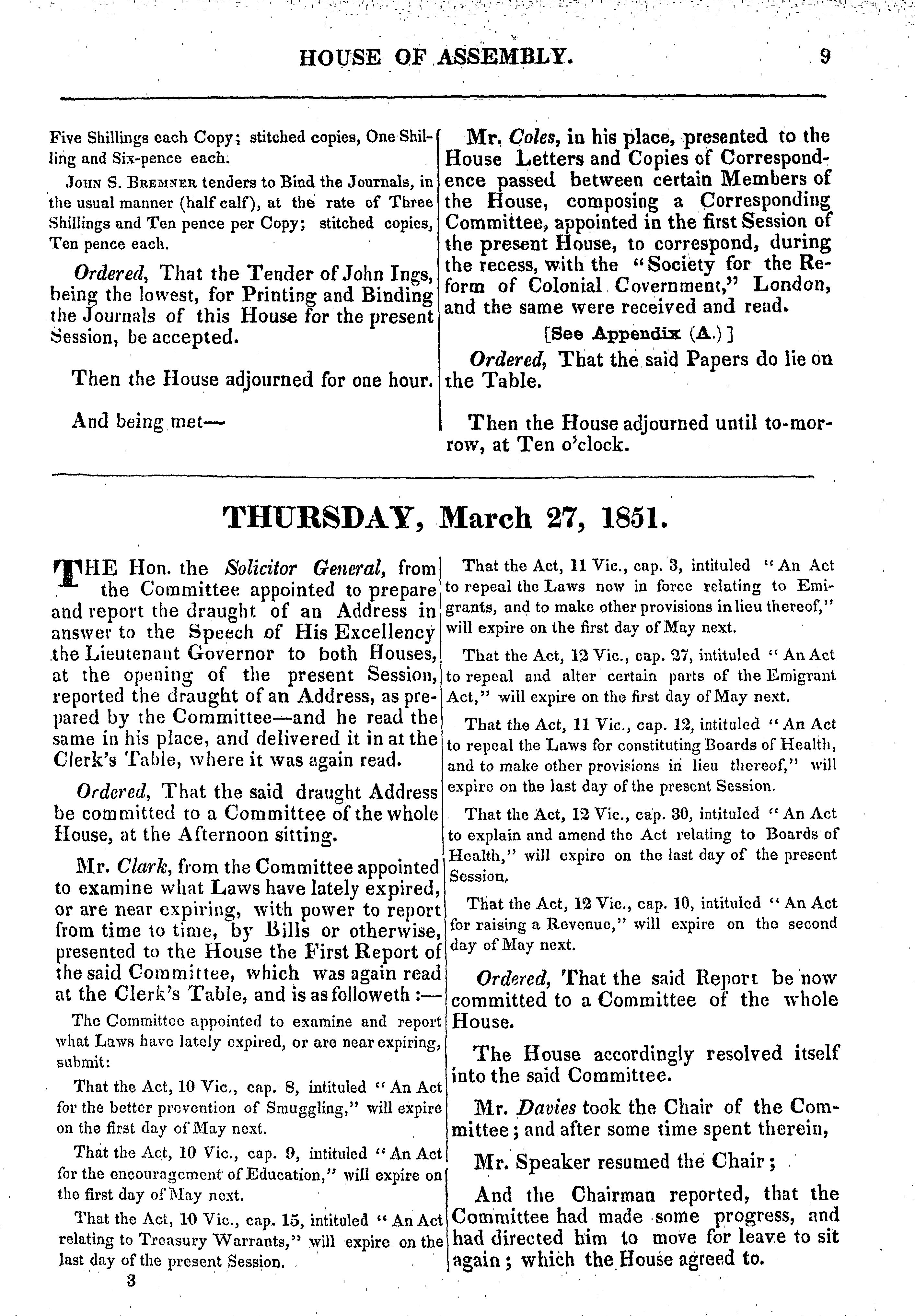 Journal of the House of Assembly of Prince Edward Island : anno decimo quarto, Victoriæ Reginæ, third session of the eighteenth General Assembly : 1851