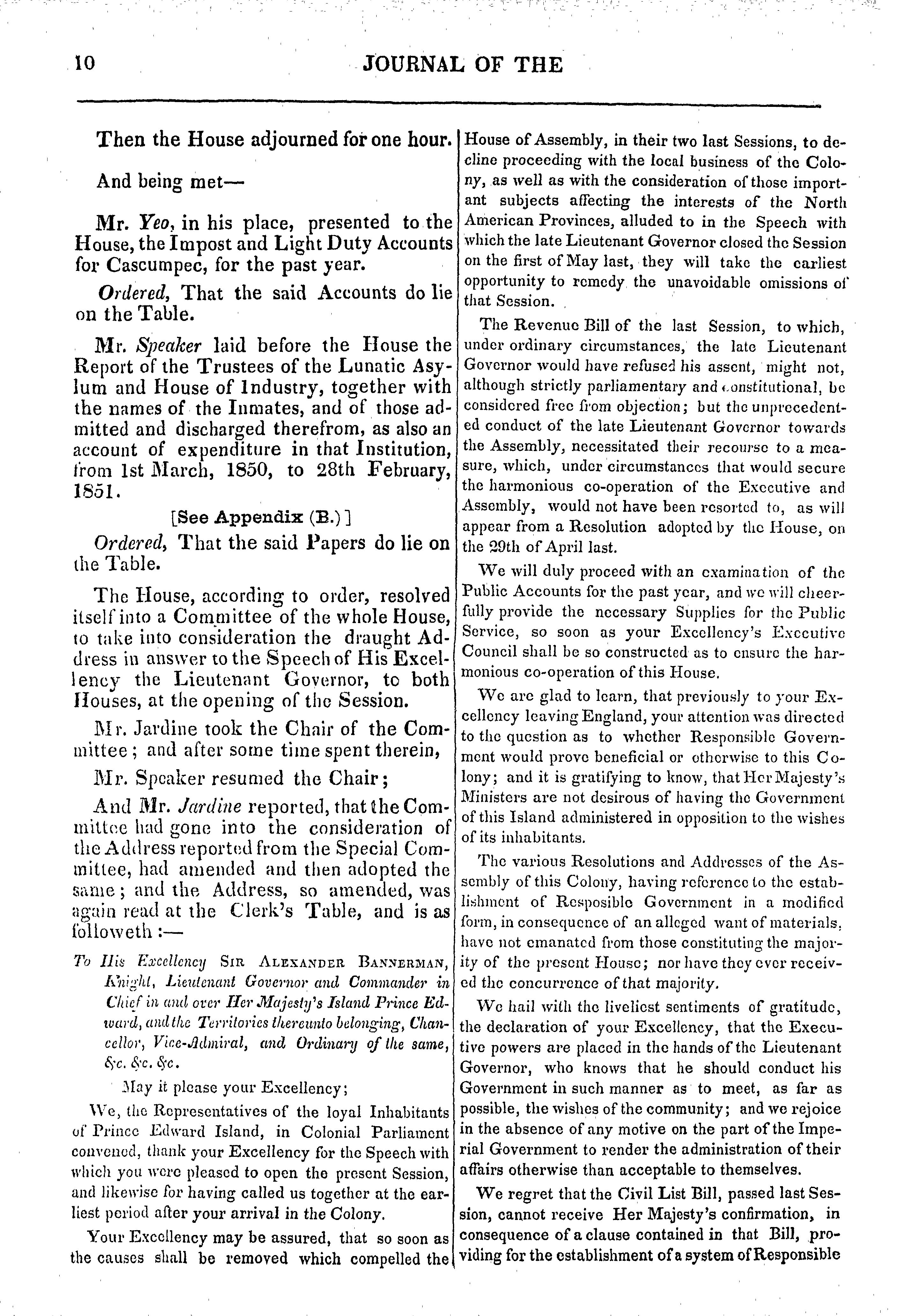 Journal of the House of Assembly of Prince Edward Island : anno decimo quarto, Victoriæ Reginæ, third session of the eighteenth General Assembly : 1851