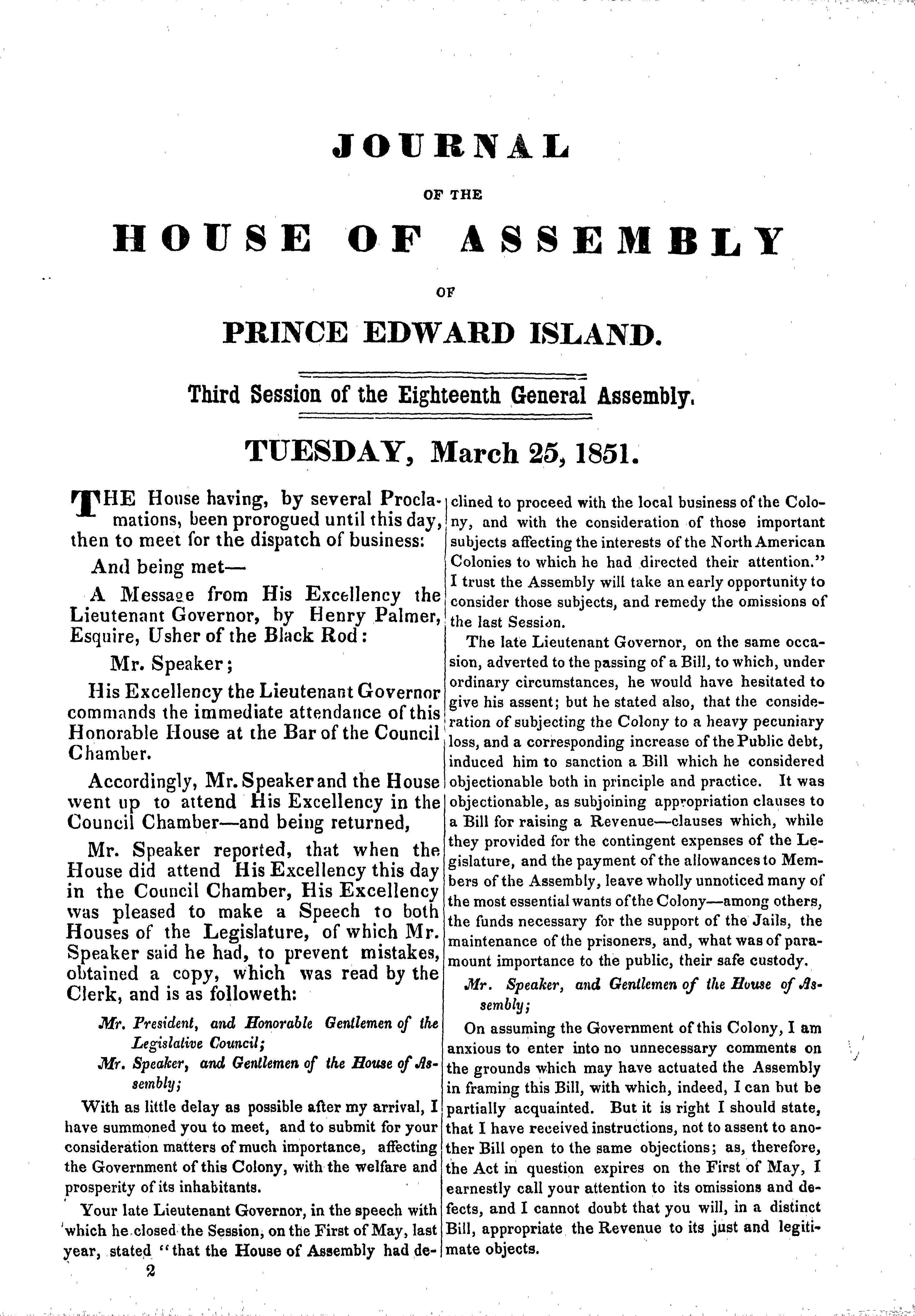Journal of the House of Assembly of Prince Edward Island ... : Journal of the House of Assembly of Prince Edward Island : anno decimo quarto, Victoriæ Reginæ, third session of the eighteenth General Assembly : 1851