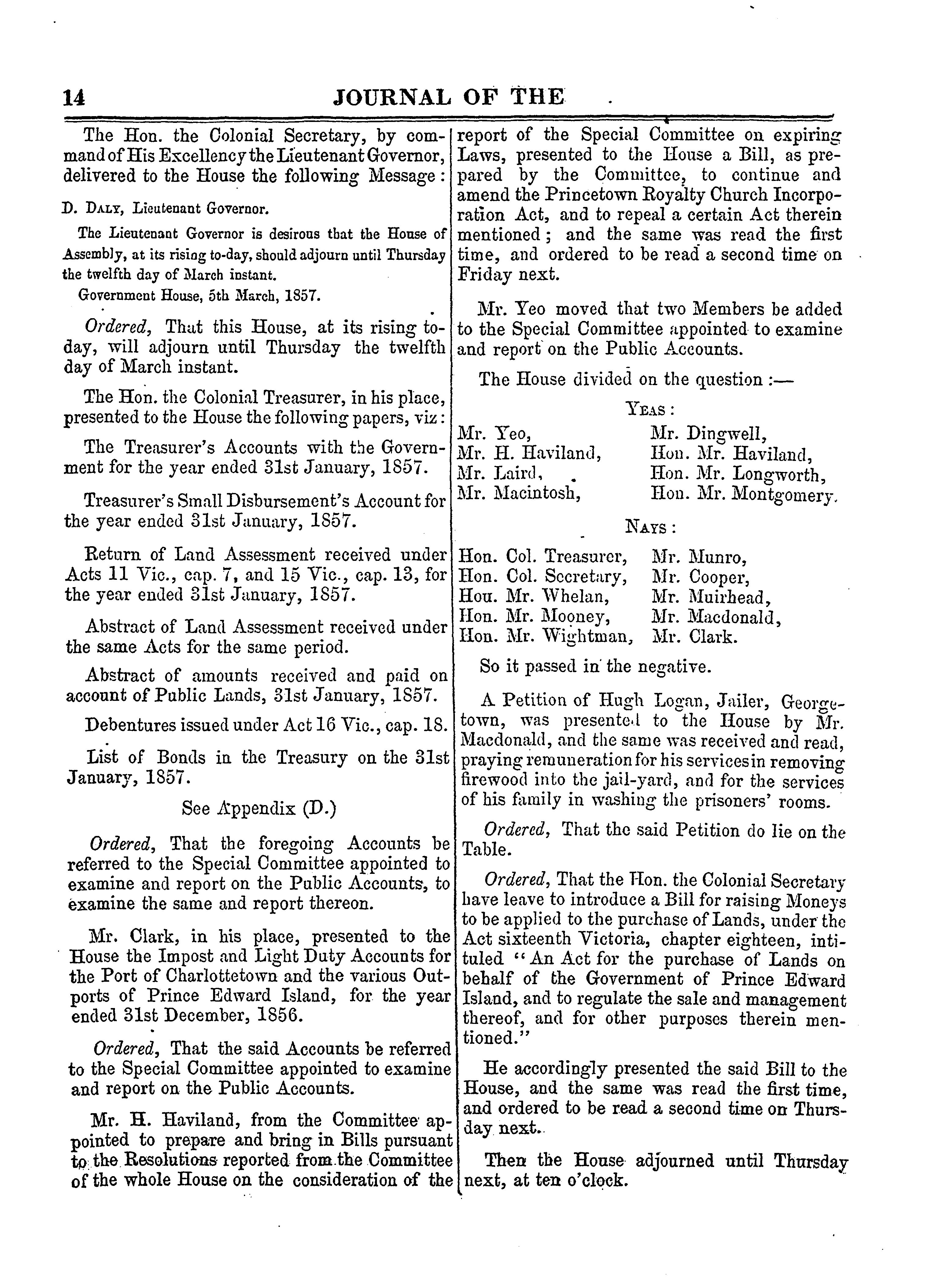 Journal of the House of Assembly of Prince Edward Island : anno vicesimo Victoriæ Reginæ, third session of the twentieth General Assembly : 1857