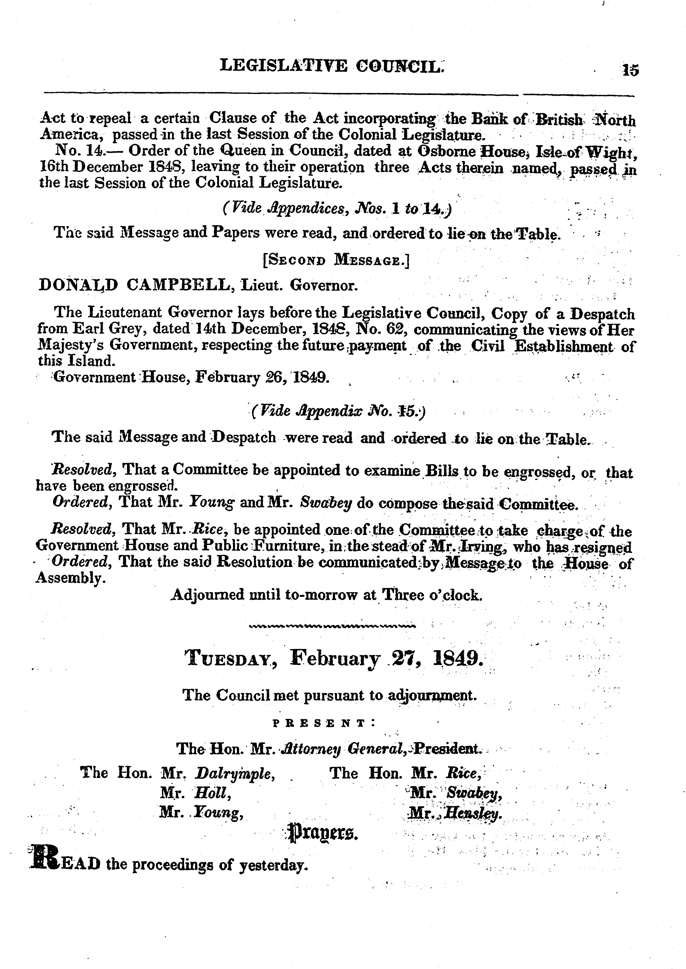 Journal of His Majesty's Council of Prince Edward Island : Journal of the Legislative Council of Prince Edward Island : anno duodecimo Victoriæ Reginæ, third session of the seventeenth General Assembly : 1849