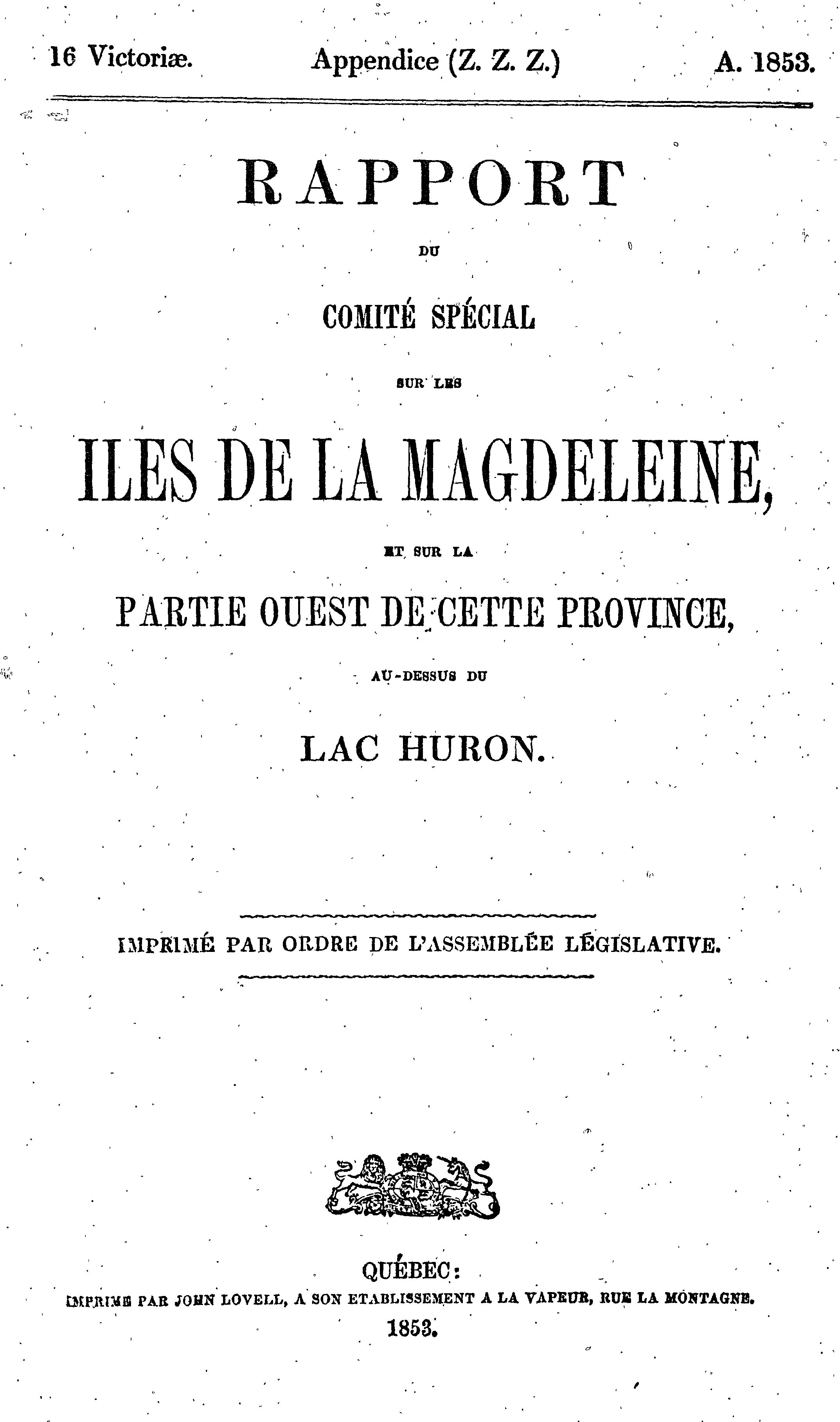 Appendice du onzième volume des journaux de l'Assemblée législative de la Province du Canada, depuis le 19 août 1852, jusqu'au 14 juin 1853, ces deux jours inclus, et dans la seizième année du règne de notre souveraine dame la Reine Victoria, étant la première session du quatrième Parlement provincial du Canada : 1852/53 (pt. 8)