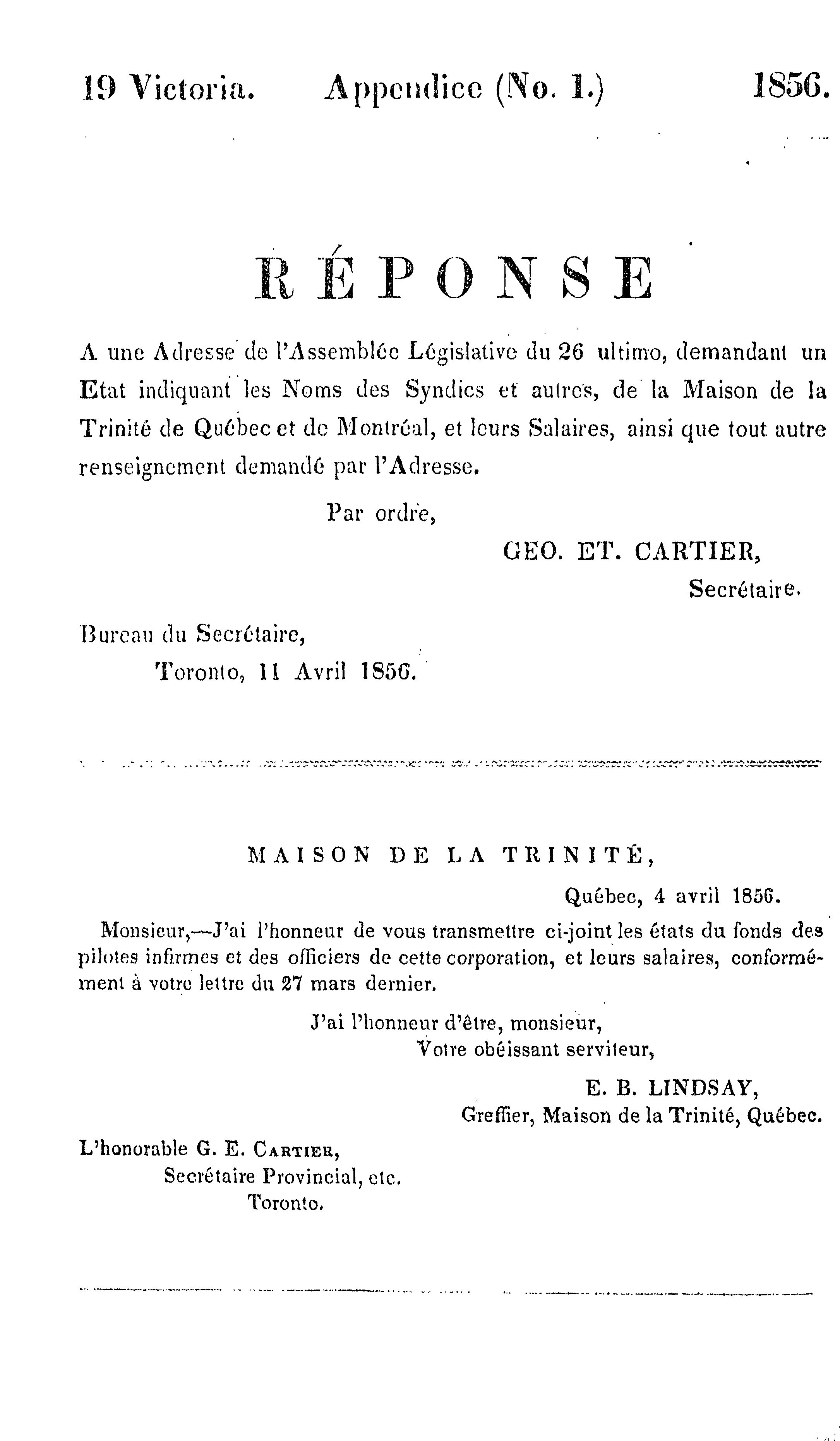 Appendice du ... des Journaux de l'Assemblée législative de la Province du Canada ... : Appendice du quatorzième volume des journaux de l'Assemblée législative de la Province du Canada, depuis le 15 février jusqu'au 1er juillet 1856, ces deux jours inclus, dans la dix-neuvième et vingtième années du règne de notre souveraine dame la Reine Victoria, étant la 2me session du 5me Parlement provincial du Canada : 1856 (pt. 1)