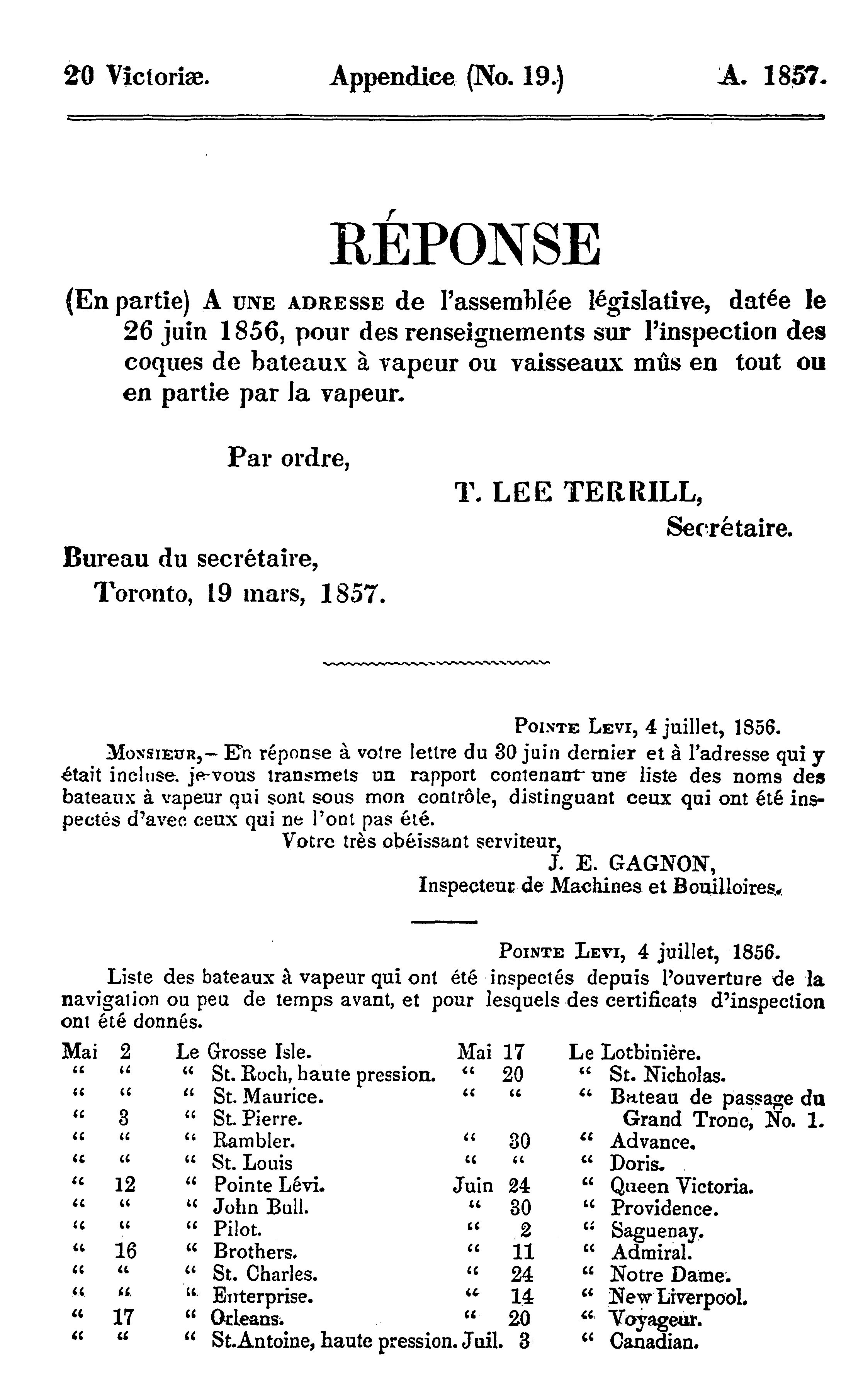 Appendice du quinzième volume des journaux de l'Assemblée législative de la Province du Canada, depuis le 26 février jusqu'au 10 juin 1857, inclusivement, dans la vingtième année du règne de notre souveraine dame la Reine Victoria, étant la 3me session du 5me Parlement provincial du Canada : 1857 (pt. 4)
