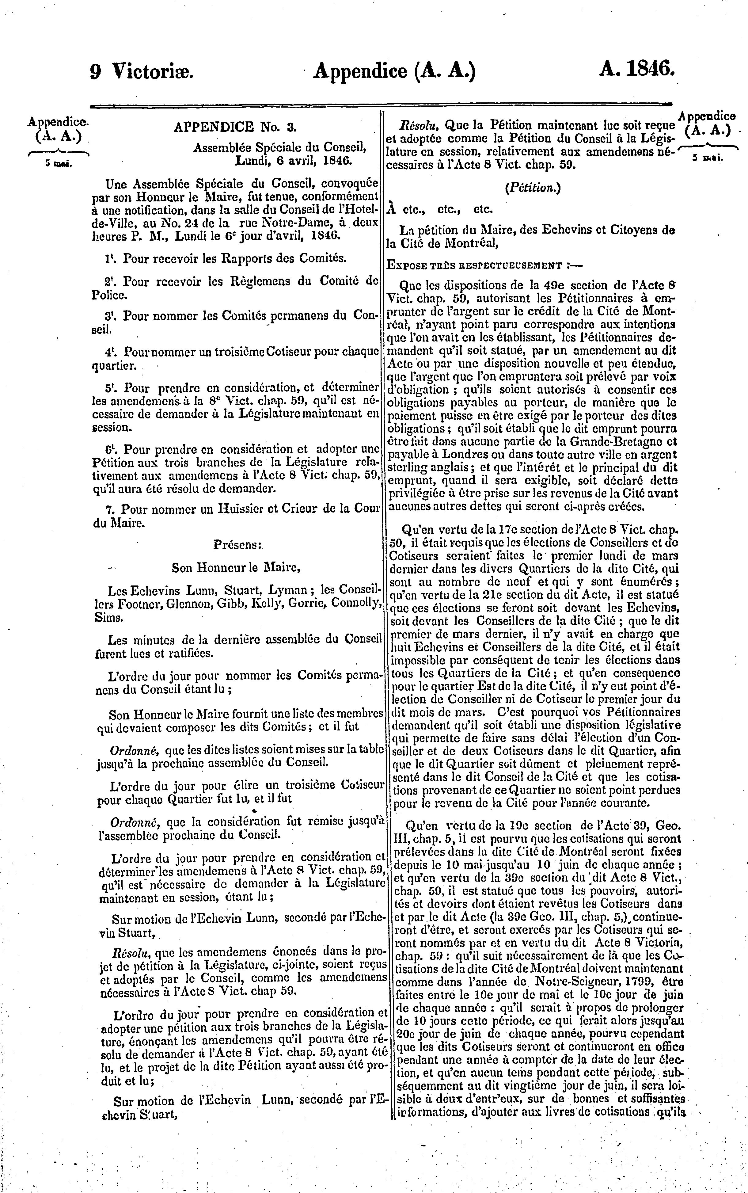 Appendice du cinquième volume des journaux de l'Assemblée législative de la Province du Canada, depuis le 20 mars, jusqu'au 9 juin, 1846, ces deux jours compris, et dans la neuvième année du règne de notre souveraine dame da Reine Victoria, seconde session du deuxième Parlement provincial du Canada : 1846 (pt. 3)