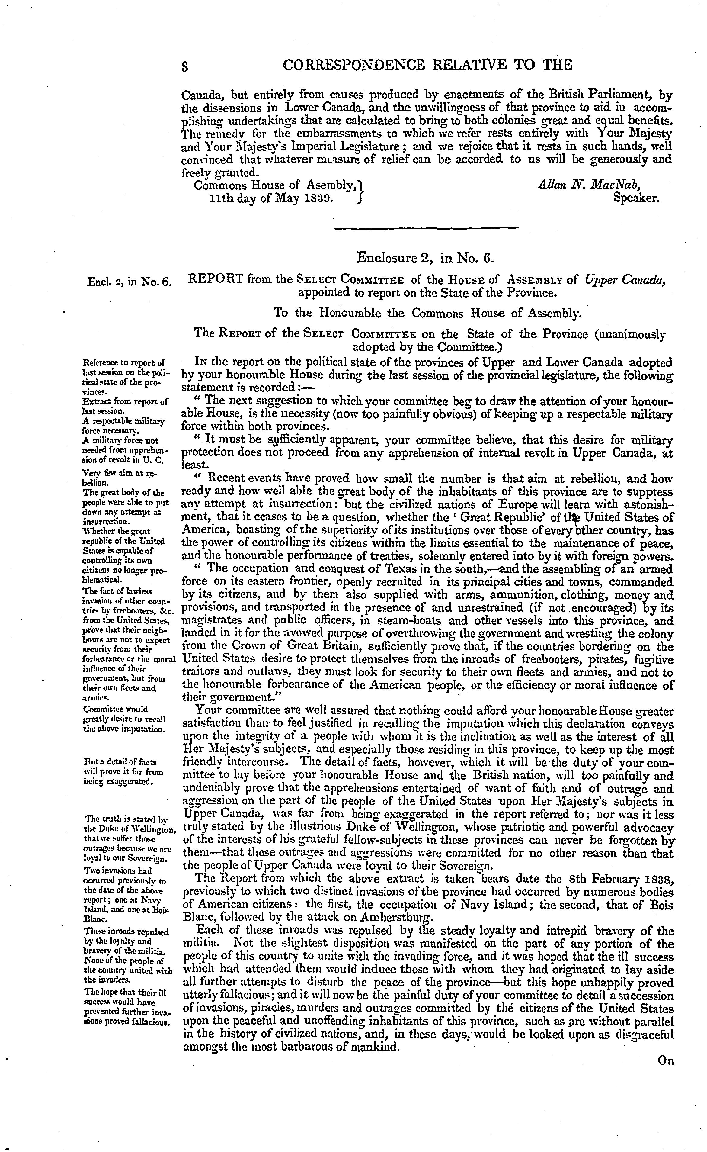 A variant of this item has the same text, but its title lacks the word " Canada," its subtitle reads "presented by Her Majesty's command," and the number at the foot of the t.p. is "103" below the phrase "ordered to be printed 10th June 1839."