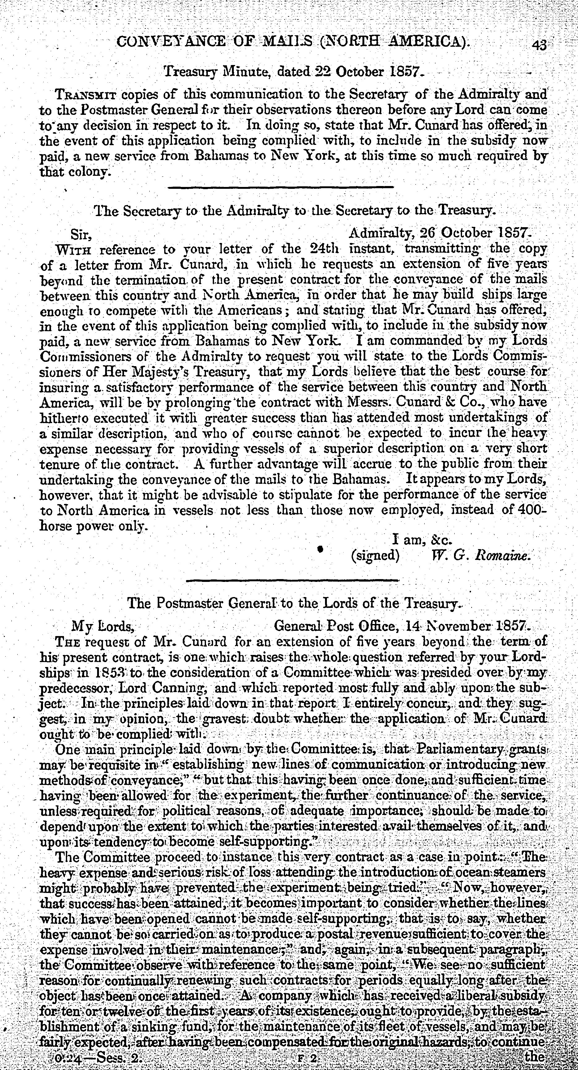Conveyance of mails (North America) : return to an address of the Honourable the House of Commons, dated 7 July 1859, for, Copies of all correspondence between Her Majesty's government and the provincial government of Canada, in reference to the conveyance of mails between this country and British North America ; of an address to Her Majesty ; ... and of all correspondence between Her Majesty's government and the British and North American Royal Mail Steam Packet Company or Sir Samuel Cunard, Baronet, on the subject of the prolongation or renewal of the contract made with that company for the conveyance of the mails to and from North America. - Adresse bibliographique