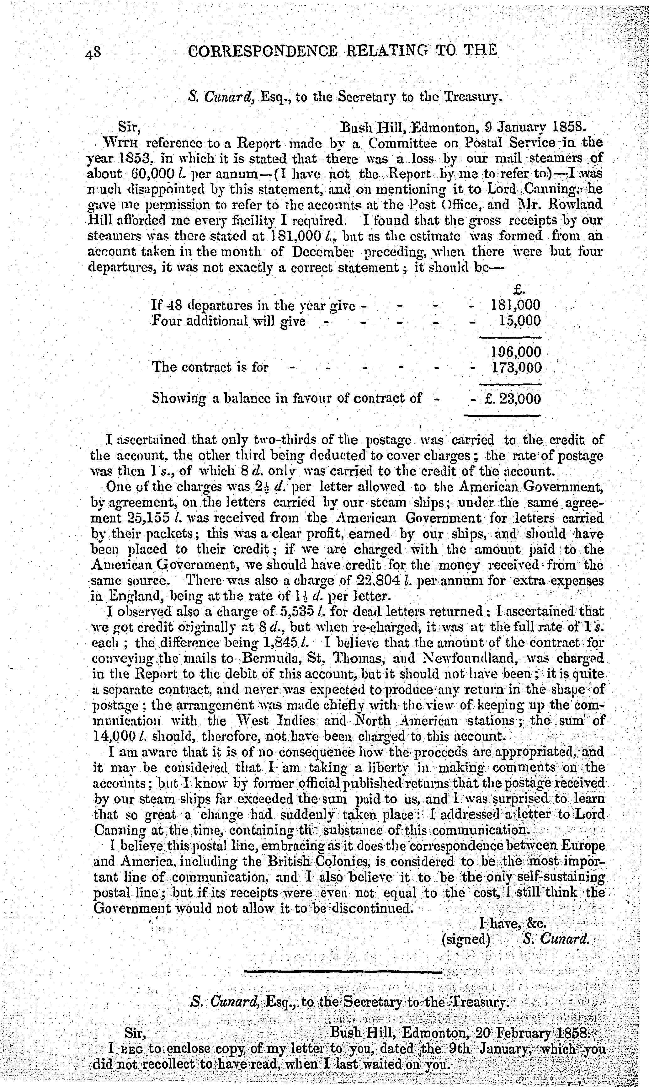Conveyance of mails (North America) : return to an address of the Honourable the House of Commons, dated 7 July 1859, for, Copies of all correspondence between Her Majesty's government and the provincial government of Canada, in reference to the conveyance of mails between this country and British North America ; of an address to Her Majesty ; ... and of all correspondence between Her Majesty's government and the British and North American Royal Mail Steam Packet Company or Sir Samuel Cunard, Baronet, on the subject of the prolongation or renewal of the contract made with that company for the conveyance of the mails to and from North America. - Adresse bibliographique