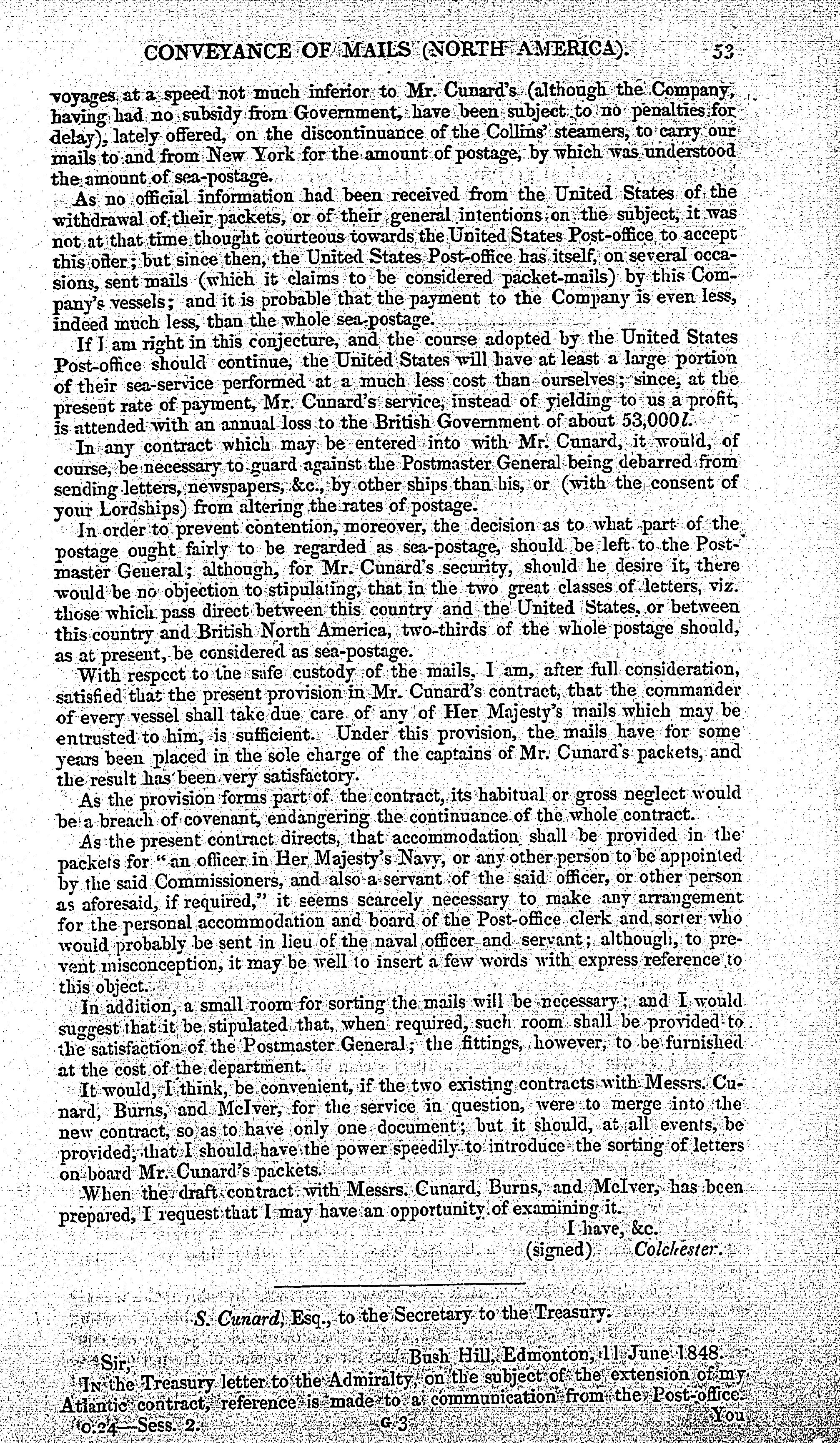 Conveyance of mails (North America) : return to an address of the Honourable the House of Commons, dated 7 July 1859, for, Copies of all correspondence between Her Majesty's government and the provincial government of Canada, in reference to the conveyance of mails between this country and British North America ; of an address to Her Majesty ; ... and of all correspondence between Her Majesty's government and the British and North American Royal Mail Steam Packet Company or Sir Samuel Cunard, Baronet, on the subject of the prolongation or renewal of the contract made with that company for the conveyance of the mails to and from North America. - Adresse bibliographique
