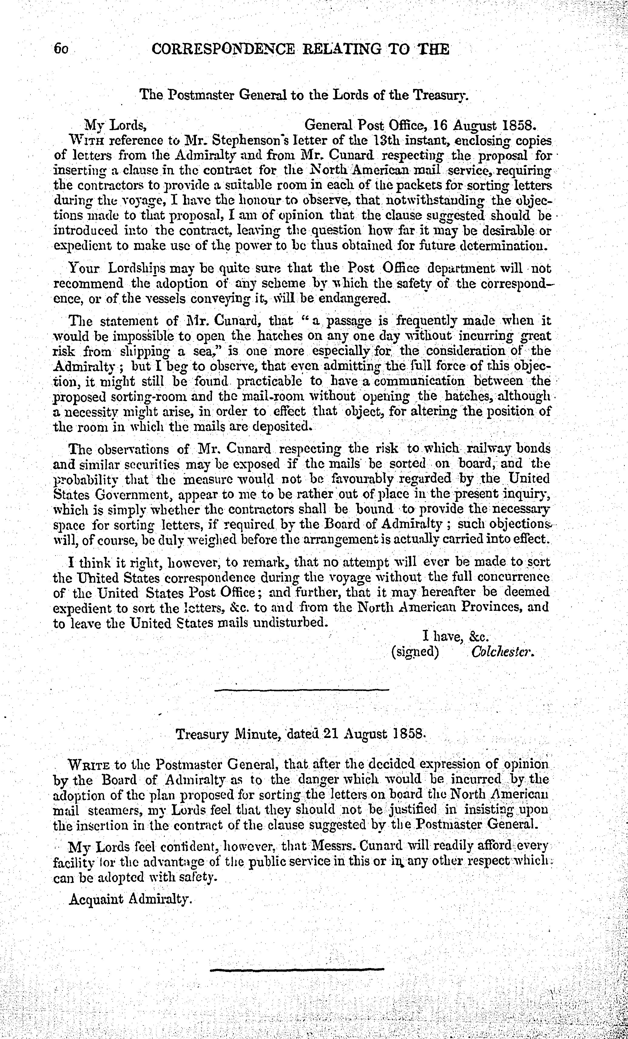 Conveyance of mails (North America) : return to an address of the Honourable the House of Commons, dated 7 July 1859, for, Copies of all correspondence between Her Majesty's government and the provincial government of Canada, in reference to the conveyance of mails between this country and British North America ; of an address to Her Majesty ; ... and of all correspondence between Her Majesty's government and the British and North American Royal Mail Steam Packet Company or Sir Samuel Cunard, Baronet, on the subject of the prolongation or renewal of the contract made with that company for the conveyance of the mails to and from North America. - Adresse bibliographique