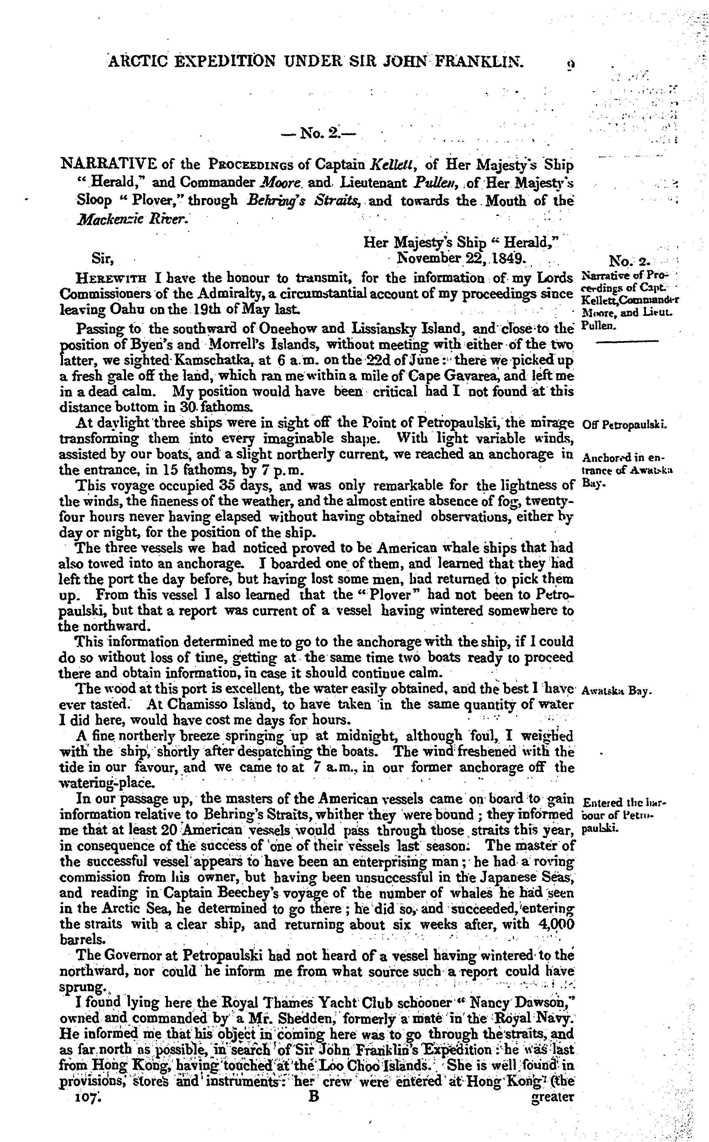 Return to an order of the Honourable the House of Commons, dated 5 February 1850, for copies "of any reports or statements from the officers employed in the Arctic expeditions, or from any other persons, which have been laid before the lords commissioners of the Admiralty, in respect to the resumption of the search for Sir John Franklin's expedition" ...