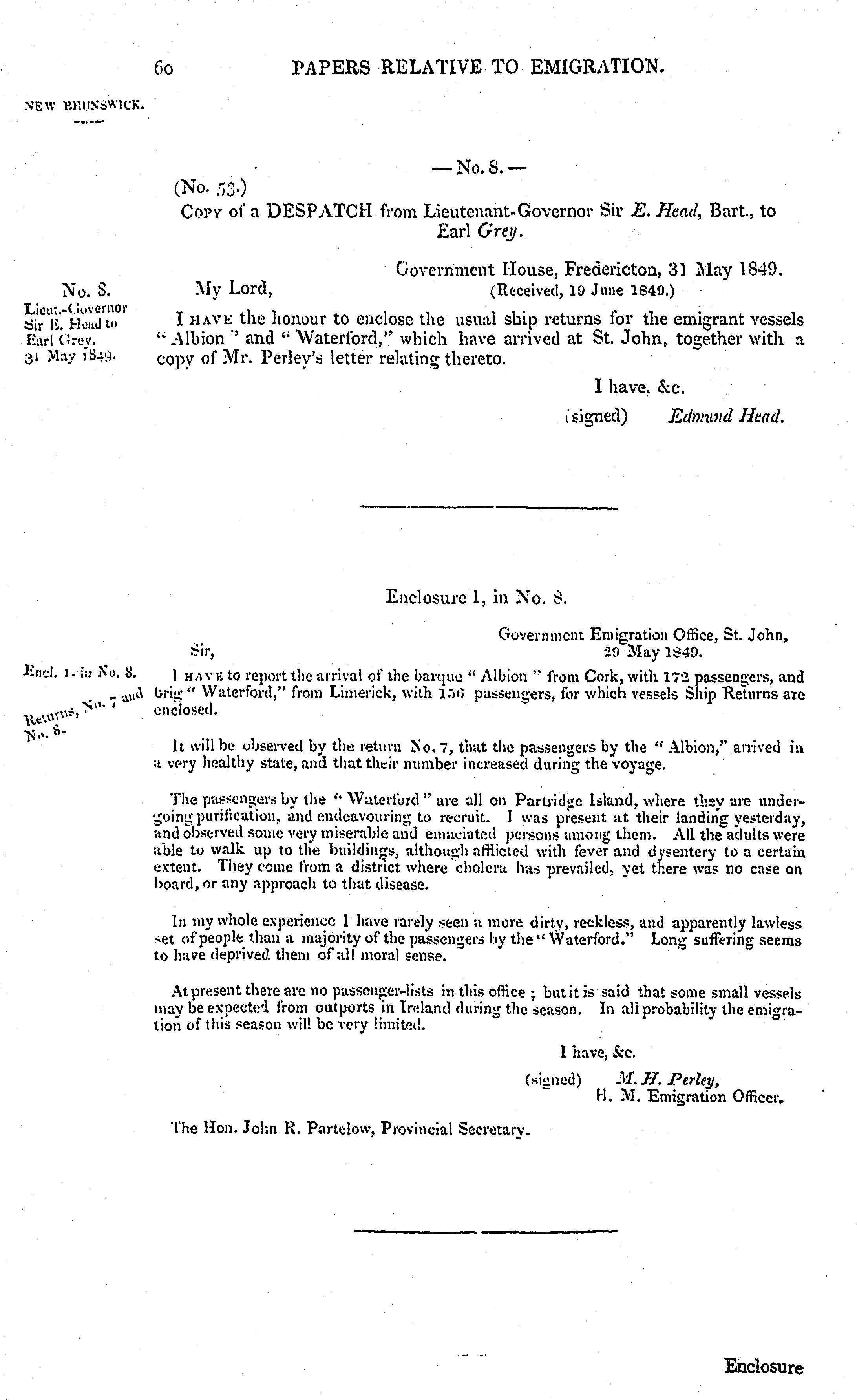 Emigration (North American and Australian colonies) : returns to two addresses of the Honourable the House of Commons, dated 15 May and 27 July 1849, viz. address, 15 May, "Copies or extracts of any despatches relative to emigration to the North American and Australian colonies, in continuation of the papers presented to this House in August 1848 and February 1849" (Mr. Monsell), address, 27 July, " Copies or extracts of any despatches relative to emigration to the North American and Australian colonies, since those moved for on the 15th day of May last" (Mr. Hawes) ... Part II -North American colonies. - Adresse bibliographique