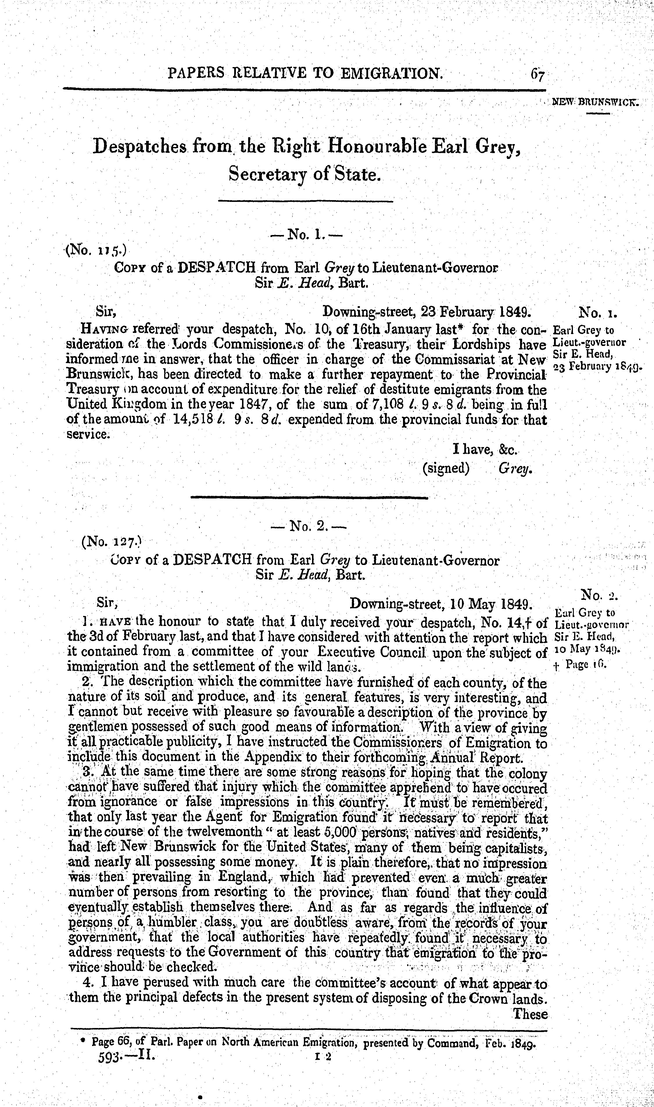 Emigration (North American and Australian colonies) : returns to two addresses of the Honourable the House of Commons, dated 15 May and 27 July 1849, viz. address, 15 May, "Copies or extracts of any despatches relative to emigration to the North American and Australian colonies, in continuation of the papers presented to this House in August 1848 and February 1849" (Mr. Monsell), address, 27 July, " Copies or extracts of any despatches relative to emigration to the North American and Australian colonies, since those moved for on the 15th day of May last" (Mr. Hawes) ... Part II -North American colonies. - Adresse bibliographique