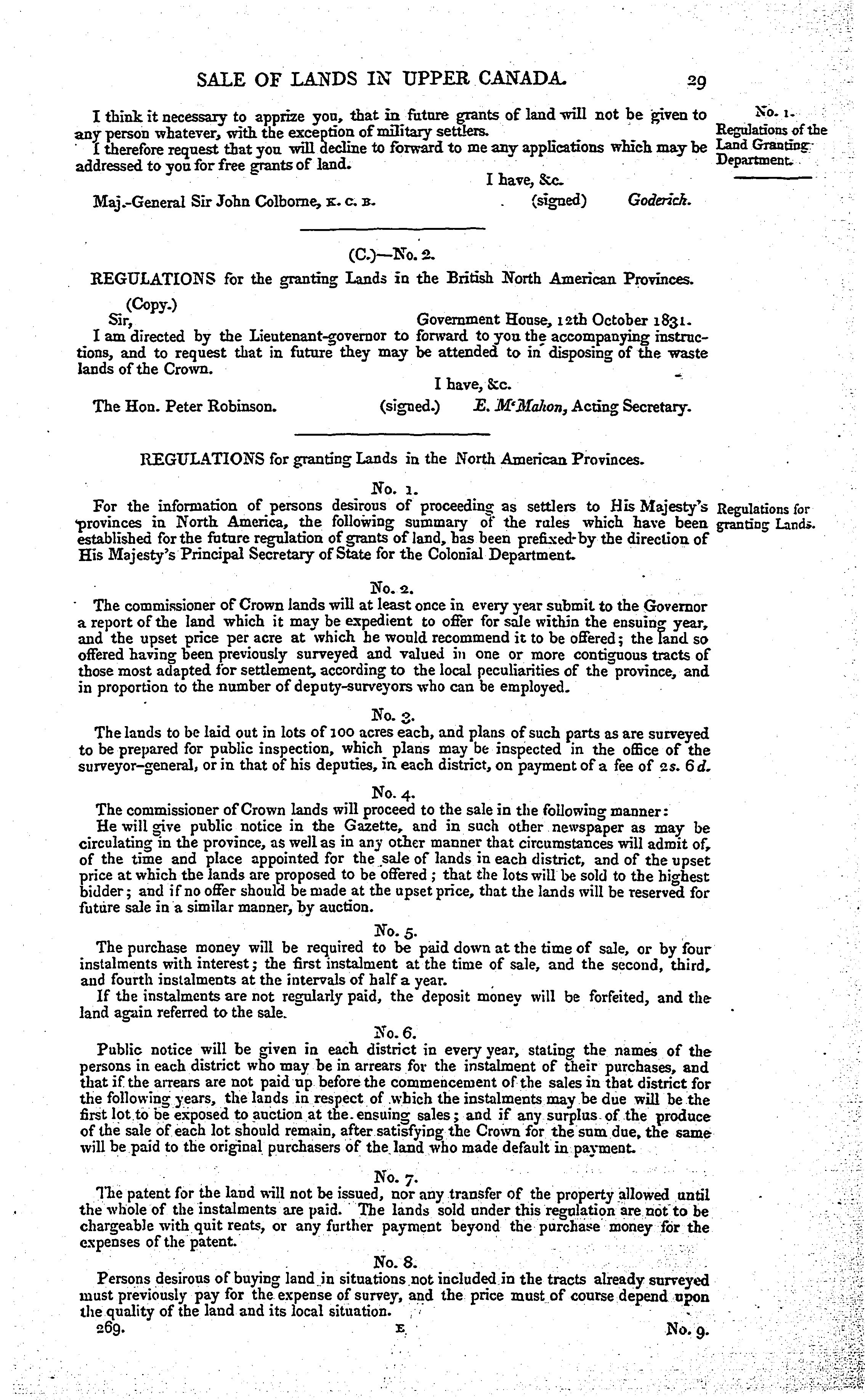 Orders in council relating to the sale of lands in Upper Canada