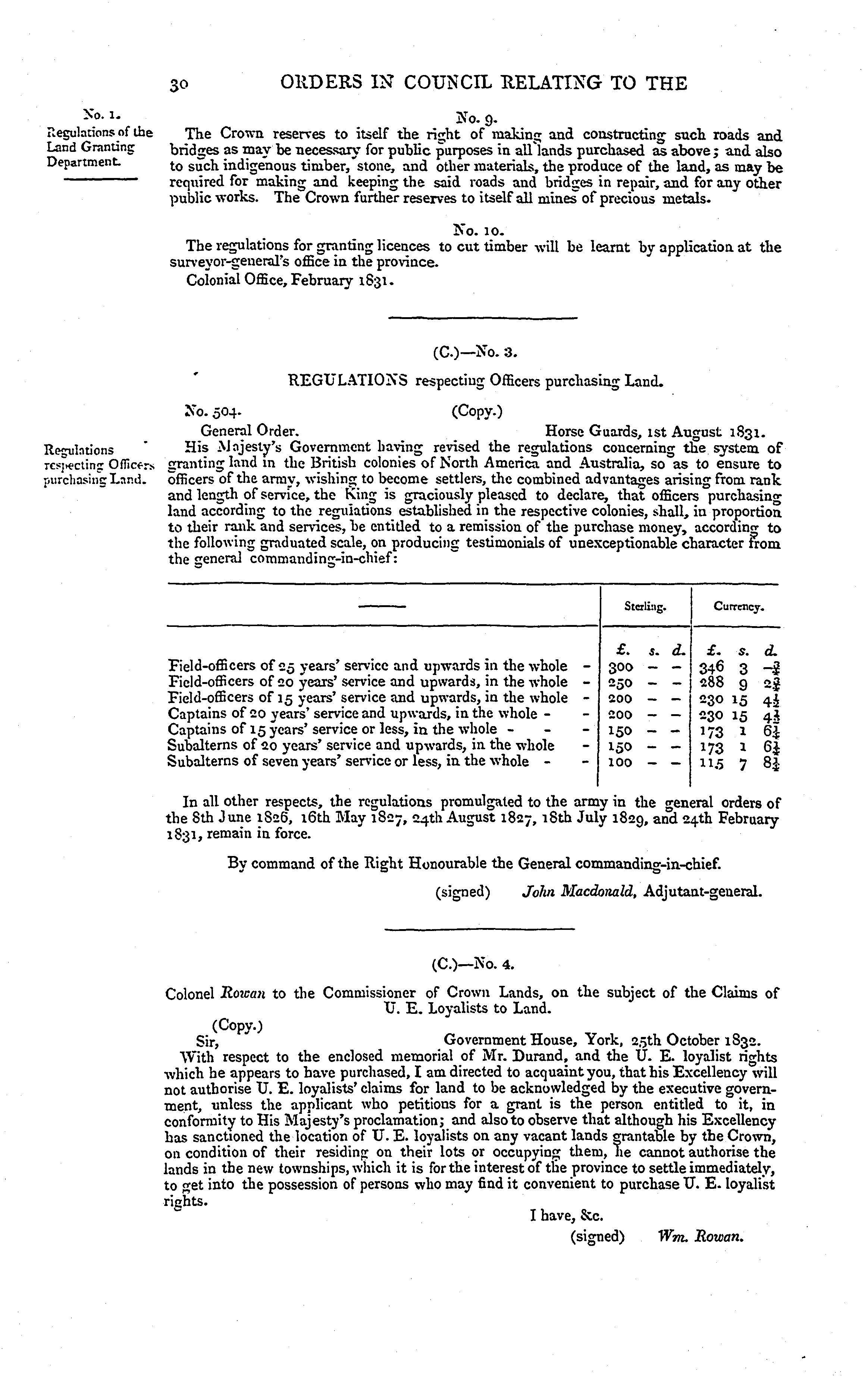 Orders in council relating to the sale of lands in Upper Canada